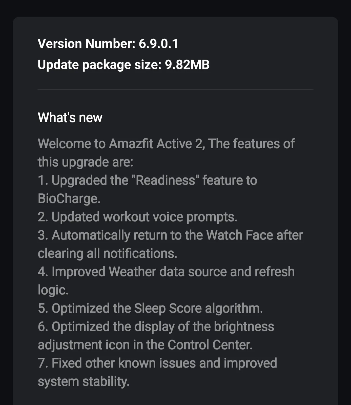 A régebbi szoftver 6.7.0.1 verziója, amely 2025 decemberében jelent meg, állítólag a BioCharge energiaszint-figyelő eszközt hozta el az Active 2 okosórára. Azonban e viselhető eszközök korábbi egységeinek egyes felhasználói arról számoltak be, hogy nem tudtak hozzáférni ehhez a funkcióhoz. Most, a 6.9.0.1 verzióval a BioCharge minden felhasználó számára elérhető, beleértve azokat az okosórákat is, amelyek 32 MB PSRAM-mal rendelkeznek.