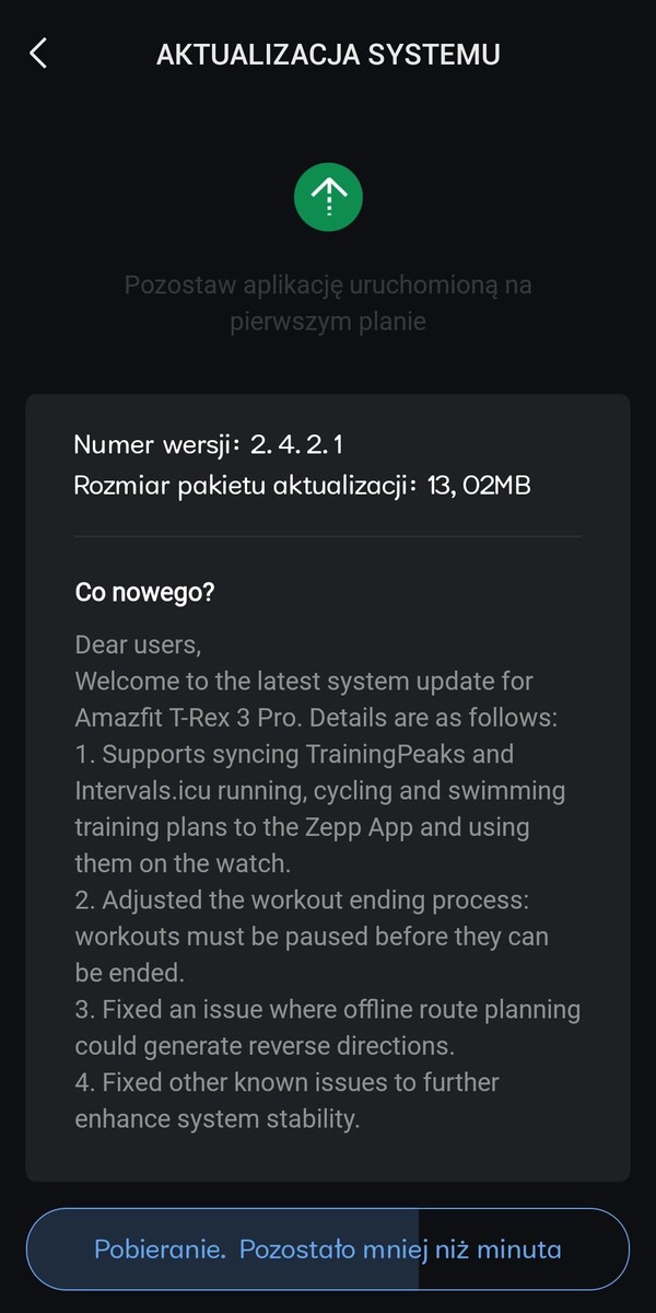 A 2.4.2.1 szoftververzióról a T-Rex 3 Pro felhasználói a Reddit oldalon számoltak be. A megosztott változtatási napló (alább) szerint a kiadás javított integrációt hoz a TrainingPeaks és az Intervals.icu oldalakkal. Mostantól szinkronizálhatók a futás, kerékpározás és úszás edzéstervek a Zepp alkalmazással, és ezek az okosórán is elérhetők. Van egy másik edzéssel kapcsolatos változás is, ami azt jelenti, hogy a felhasználóknak mostantól szüneteltetniük kell az edzést, mielőtt azt befejezhetnék.
