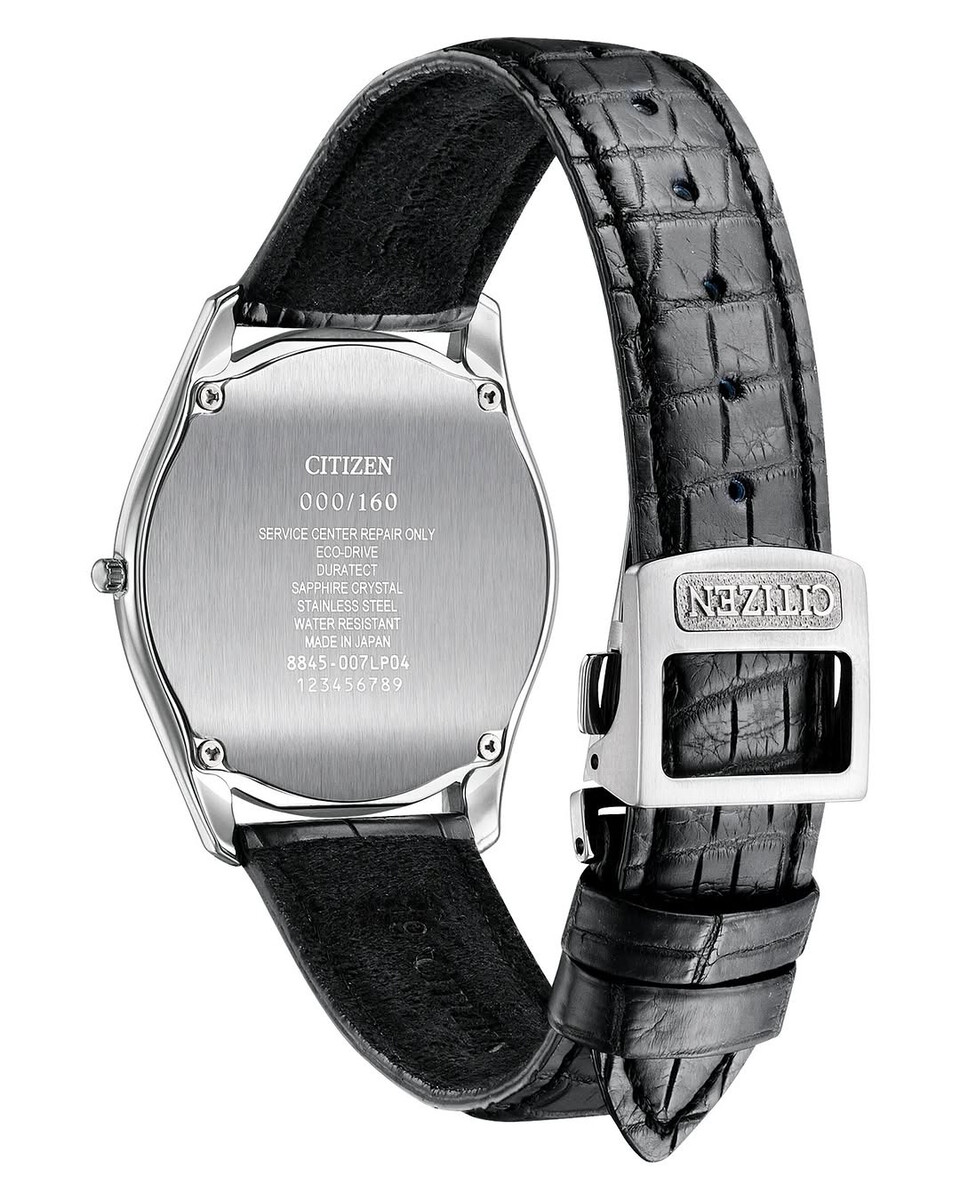 A hátlapról az óra egyértelműen kijelenti identitását a "000/160" bélyegzővel ellátott, csiszolt hátlapon, utalva a limitált szériás státuszra. A Citizen 8845 Eco-Drive óraművel működik, amely a környezeti fényen keresztül táplálja az órát, és nem igényel elemcserét. Duratect edzés, karcálló zafírkristály és japán gyártmányú kivitelezés egészíti ki a prémium specifikációs listát.
