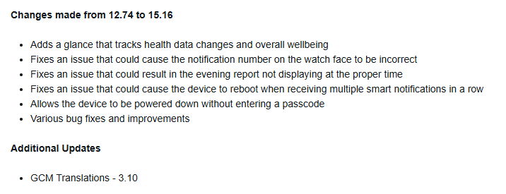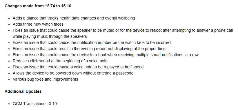 A 15.16-os verzió változásnaplója szerint a hangjegyzet megkezdésekor lejátszott kattanóhang hangereje lejjebb lett tárcsázva. A Garmin kijavított egy olyan problémát, amely miatt a hangszóró helytelenül némulhatott el, amikor megpróbáltunk válaszolni egy telefonhívásra. Kezelte továbbá az óralapon megjelenő értesítési számmal kapcsolatos problémákat, valamint az esti jelentésben megjelenő rossz időt. Ezen felül a Garmin Connect Mobile Translations 3.10-es verzióra frissült, bár nem világos, hogy ez milyen előnyökkel jár a felhasználók számára.