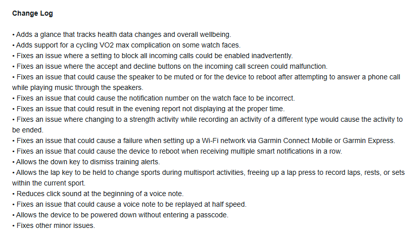 A 15.07-es béta verzió telepítése után a Forerunner 570 és Forerunner 970 okosórák felhasználói a lefelé billentyűvel elküldhetik az edzésre vonatkozó figyelmeztetéseket, a kör billentyűt lenyomva tartva válthatnak a sportágak között multisport tevékenység közben, és jelszó nélkül kikapcsolhatják a készüléket. Mindezeken felül számos hibajavítás foglalkozik a bejövő hívásokkal, az esti jelentéssel és az erőnléti aktivitással kapcsolatos problémákkal. A Garmin azt is jelzi, hogy csökkentette a hangbejegyzés elején lejátszott kattogó zajt. A teljes változtatási napló képernyőképét alább találja.