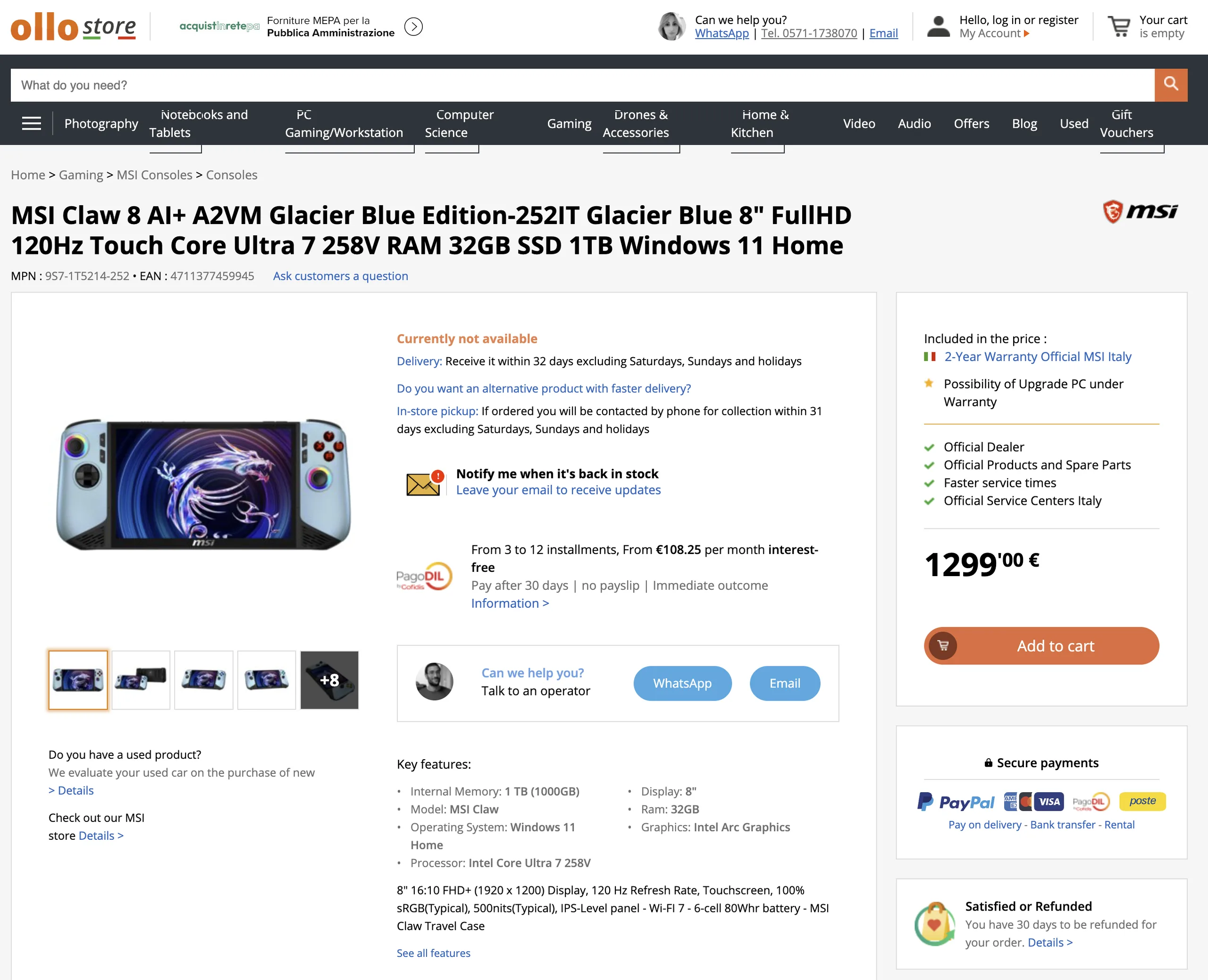Amint az alábbi képernyőképen látható, az Ollo Store a Glacier Blue Editiont 1299 euróra (~1520 dollár) árazta be, ugyanezzel a Core Ultra 7 258V processzorral, 32 GB RAM-mal és 1 TB tárhellyel rendelkezik, mint a tavaly általunk vizsgált Sandstorm változat. Összehasonlításképpen, ez utóbbi jelenleg Olaszországban 1049 euróért (~1229 dollár) kerül kiskereskedelmi forgalomba. Sajnos az MSI nem utalt arra, hogy ezeket a Glacier Blue oldallapokat külön is árulni fogja. További részletek a Glacier Blue Editionről az MSI globális weboldalán találhatók.