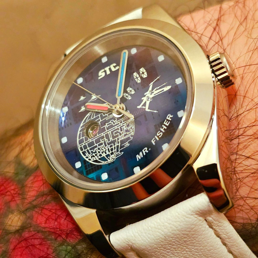 Az órán egy díszített NH38 fut belül egy 40 mm-es tokban, zafírüveggel a tetején, de a számlap az, ami azonnal megragadja a figyelmet. Ez egy ostya-stílusú design, amely Star Wars grafikákkal van kirakva - a Halálcsillag, egy pár hajó üldözésbe zárva, és egy kis szöveg "Mr. Fisher" felirattal, ami egy csinos utalás a Carrie Fisherre aki Leia hercegnőt játszotta az eredeti Star Wars-filmekben. A rácsszerű háttér és az enyhén tükröződő felület arra utal, hogy az építő valódi szilikon ostyadarabot használt alapként, bár később tisztázták, hogy csak a számlap munkája kézzel készült. A valódi litográfiai chipet nem használják, mert azok gyártásához olyan ipari szerszámokra van szükség, amelyek ára messze meghaladja a hobbisták elérhetőségét.