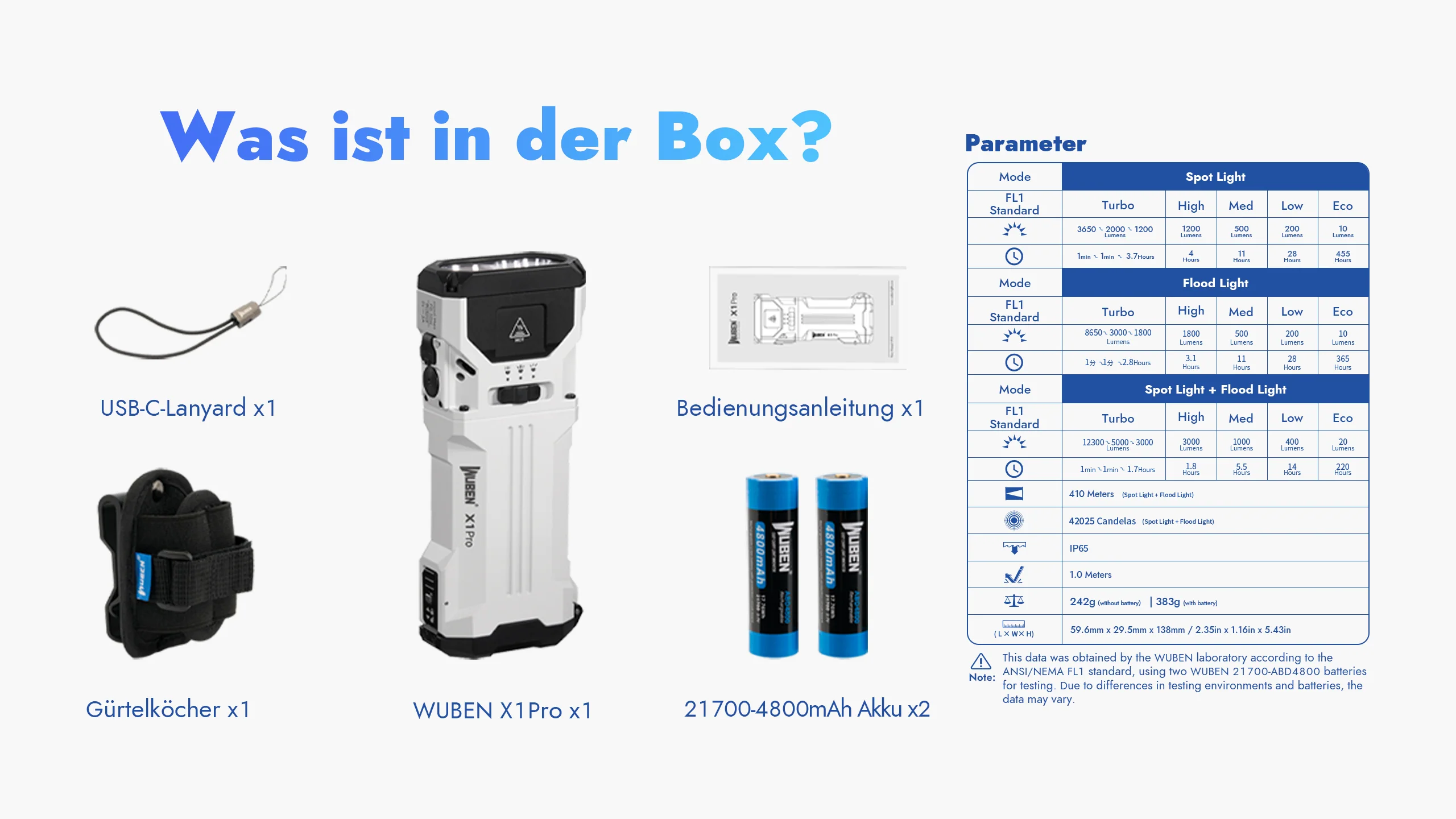 Érdemes megjegyezni, hogy a lumenértékek a reflektor (8650 lumen) és a reflektor (3650 lumen) teljesítményének kombinálásával adódnak, az utóbbi 125 fokos sugárzási tartományt kínál. Mindkét fényforrás egyszerre is használható, de a készülék ezt az üzemmódot csak egy percig képes fenntartani. Az alábbi táblázat áttekintést nyújt a különböző üzemmódokban várható akkumulátor-üzemidőről.