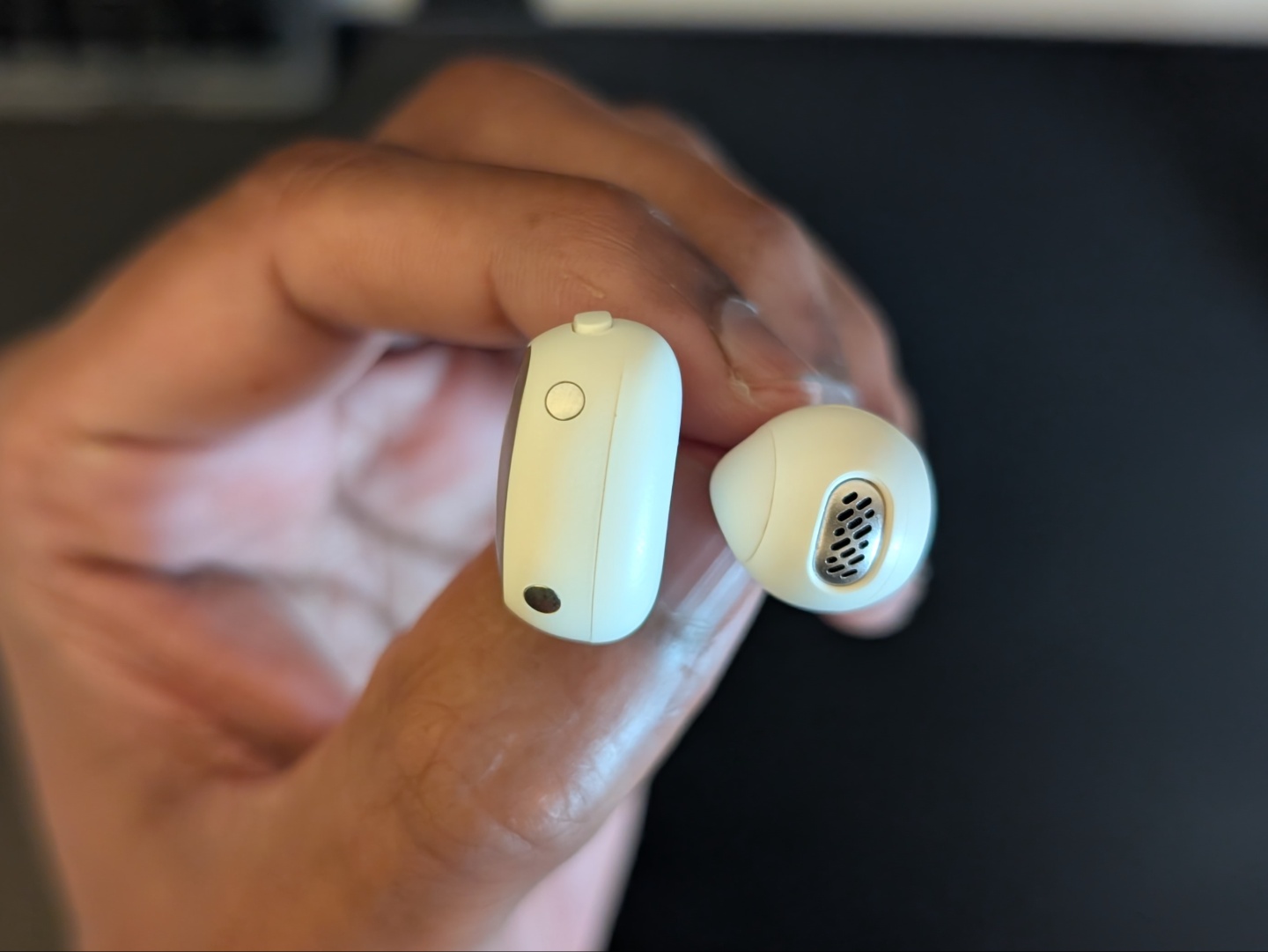 A fizikai gomb könnyen megtalálható a fül mögött, és nagyszerűen működik. A fizikai gomb előnye az érintésvezérléssel szemben, hogy a hosszú hajúaknak nem kell kifésülniük az útból, és akkor is működtethető, ha például sapkát visel.