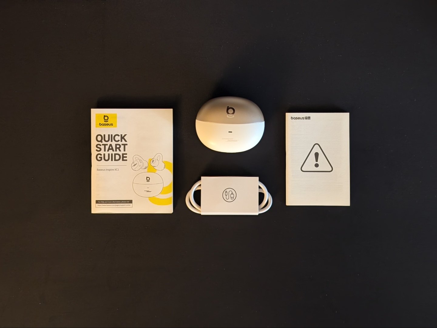 A Baseus Inspire XC1 egyszerű kicsomagolási élményt nyújt minimális csomagolással. Mivel ezek klipszes fülhallgatók, nincsenek szilikon fülkagylók. A kiskereskedelmi csomagolás tartalmaz egy gyorsindítási útmutatót és egy USB Type-C töltőkábelt.