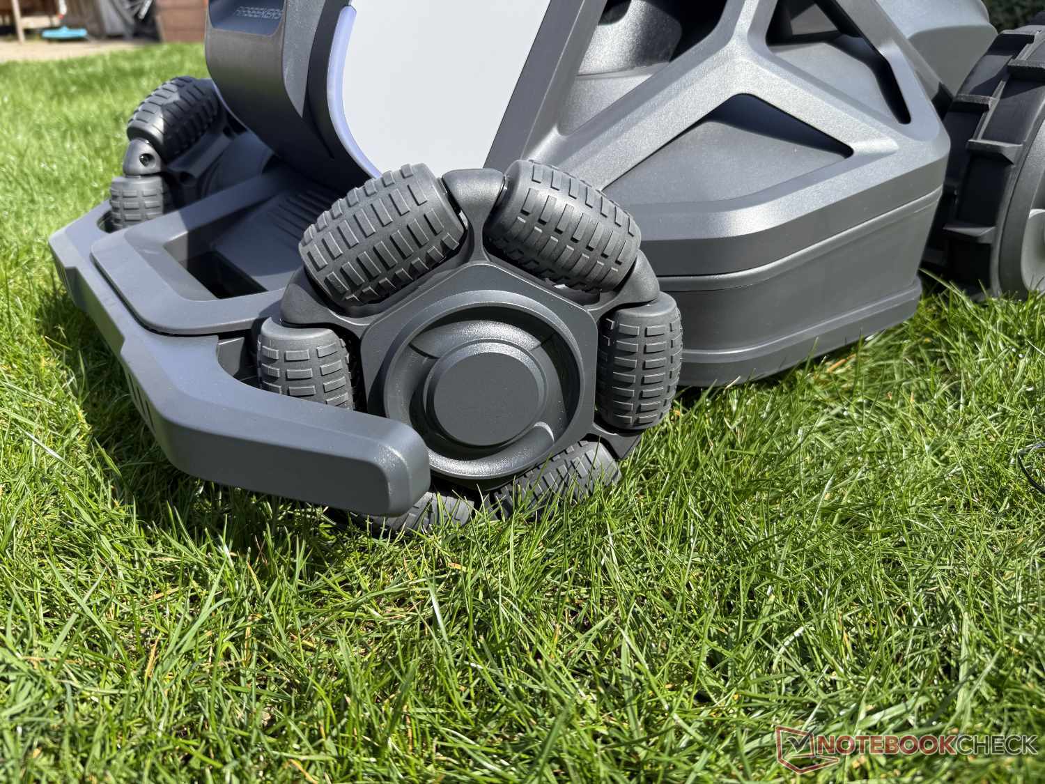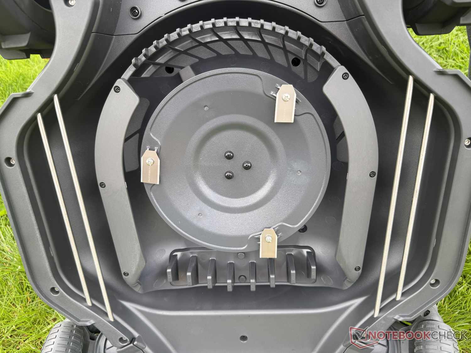 A robotfűnyíró nagyvonalú méretei ellenére nem kettős fűnyíróval, hanem egyetlen fűnyírótárcsával nyír. Ez 22 cm-es méretével szabványos méretű - és egy különlegességgel rendelkezik. Összesen hat kés van beépítve, kettő egymáson, egymástól jó centiméteres távolságra. Ezek nem csak arra szolgálnak, hogy a beállított 30 és 90 mm közötti (10 mm-es lépésekben választható) magasságra vágják a füvet, hanem egyúttal ultrafinom fűnyírást is produkálnak. A gyártó ezt FlowCut mulcsozásnak nevezi. Alternatívaként egy nagyobb, 300 mm-es fűnyírótárcsa is felszerelhető 50 $-ért.
