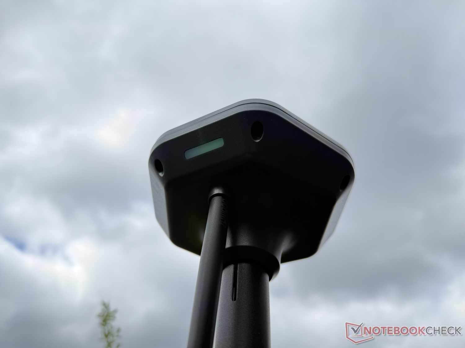 Ezután a töltőállomást földelőcsavarokkal rögzítjük a talajhoz, és (ha szükséges) az RTK antennát felállítjuk, és a hátul egy kis patent mögött lévő tápkábellel együtt csatlakoztatjuk a töltőállomáshoz. Sajnos az RTK kábel nagyon rövid. Ezért az állomást a töltőállomás közelében kell elhelyezni. Alternatívaként tesztkészülékünkhöz mellékeltek egy kiegészítő tápegységet is, amellyel az állomás távolabb is felállítható, de akkor szintén szükség van egy saját hálózati aljzatra.