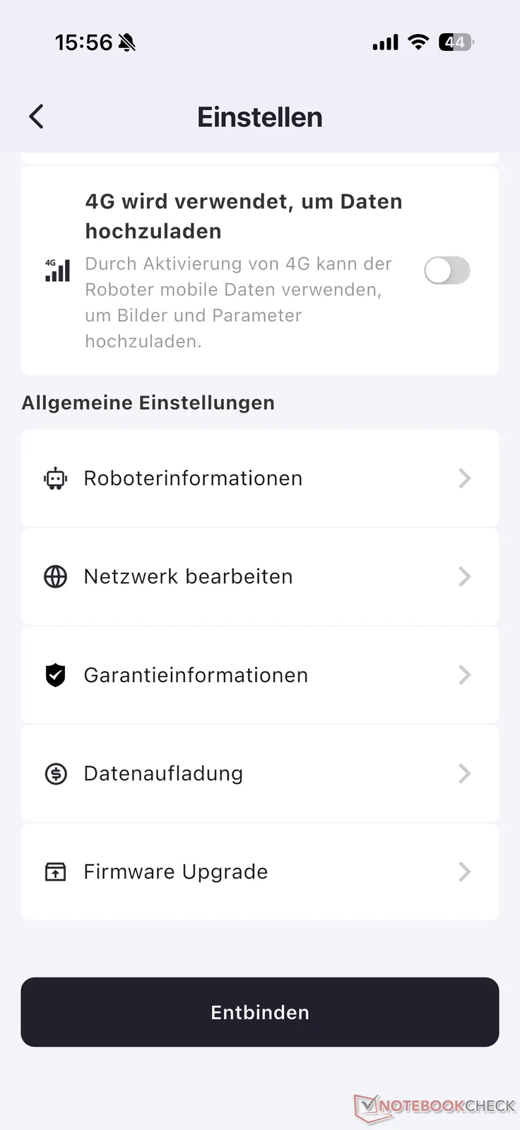 A beállítások megnyitásához a jobb felső sarokban található a klasszikus fogaskerék. Ez megnyit egy menüt, amely az RTK/nRTK, az éjszakai üzemmód, a kaszálási sorrend, a 4G aktiválás és az adattöltés, valamint a firmware-frissítések kezdetleges választékát sorolja fel a futásteljesítmény áttekintése mellett. Az akadályérzékelés érzékenységének beállítására nincsenek lehetőségek.