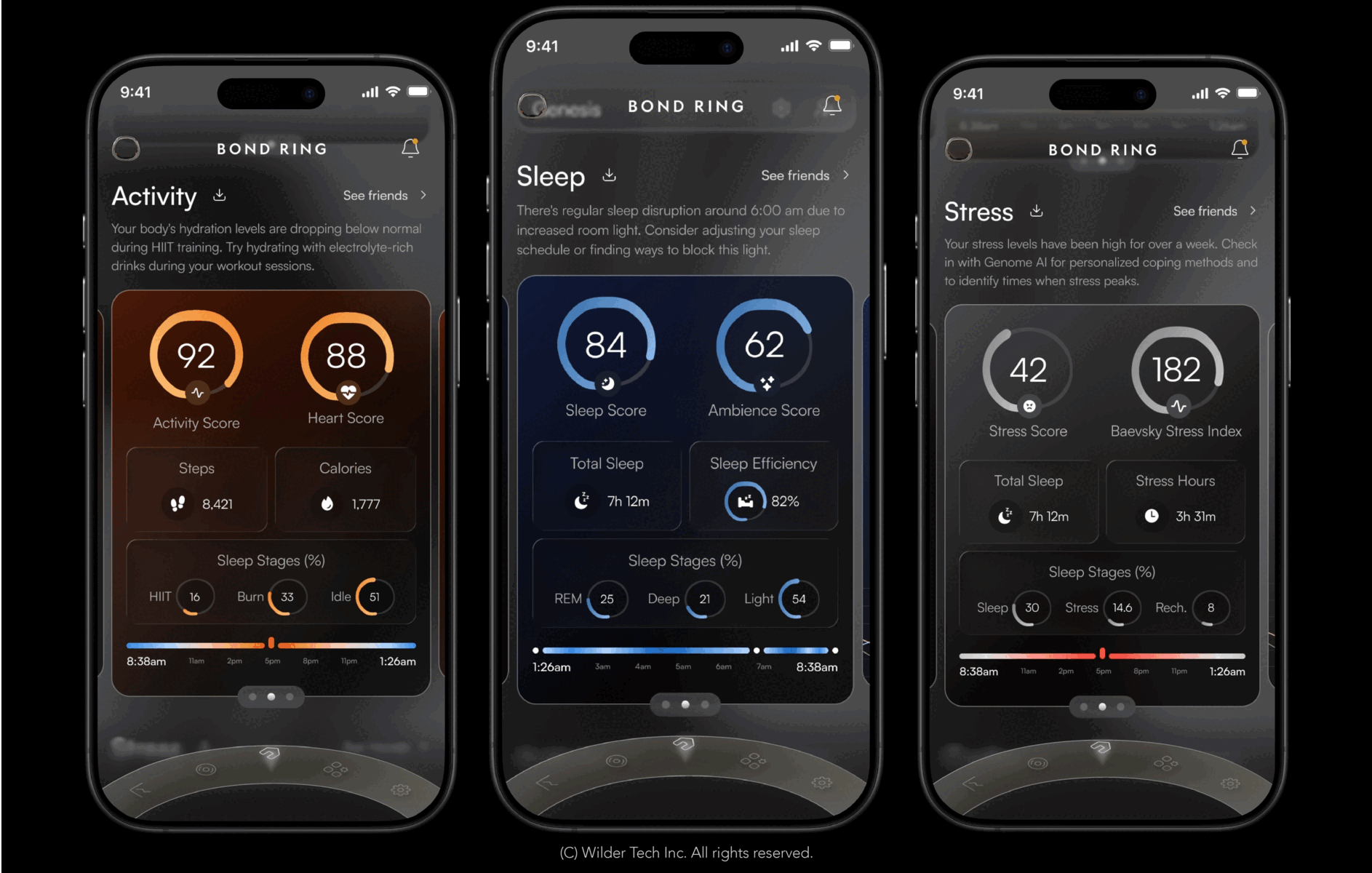 Az állítólag a gyűrűbe integrált érzékelők nagy száma szintén aggodalomra ad okot. A vállalat azt állítja, hogy a Bond Ring képes EKG-t rögzíteni, valamint mérni tudja a vérnyomás alakulását, a testhőmérsékletet, a pulzust, az oxigéntelítettséget (SpO2), a szívritmus-változékonyságot (HRV) és a maximális oxigénfelvételt (VO2 max). Állítólag a testösszetételt is méri, azaz a testzsírt, az izmokat, a csontváz tömegét és a vízbérletet. Ezek csak a belső érzékelők, mivel a kis gyűrű állítólag az UV-expozíciót, a környezeti hőmérsékletet, a környezeti fény intenzitását és a zajszintet is érzékeli.