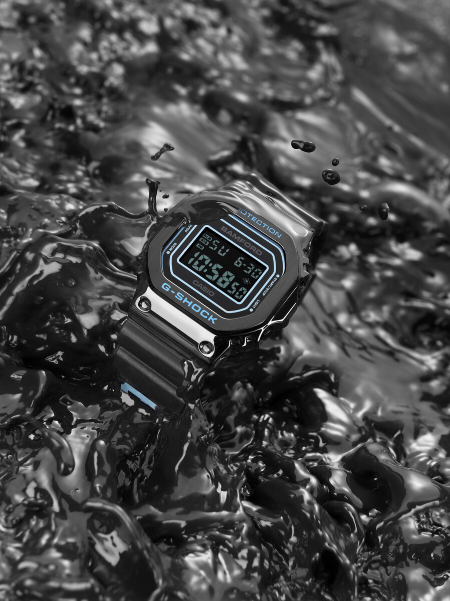 Míg az eredeti bejelentés az alapokra koncentrált - fényezett fekete felület, negatív LCD és Bamford védjegye, a világoskék akcentusok -, ezek az új képek egy kicsit jobban érzékeltetik az óra személyiségét. A drámai termékkép a GM-5600-at sűrű fekete folyadékba helyezi. Egy másik felvételen az óra látszólag olvad vagy csöpög, és megmutatja fényes külsejének csillogását. Mindkét képen látható az esztétikai kontraszt a szíjon lévő matt Bamford márkajelzés és a polírozott fémház között.