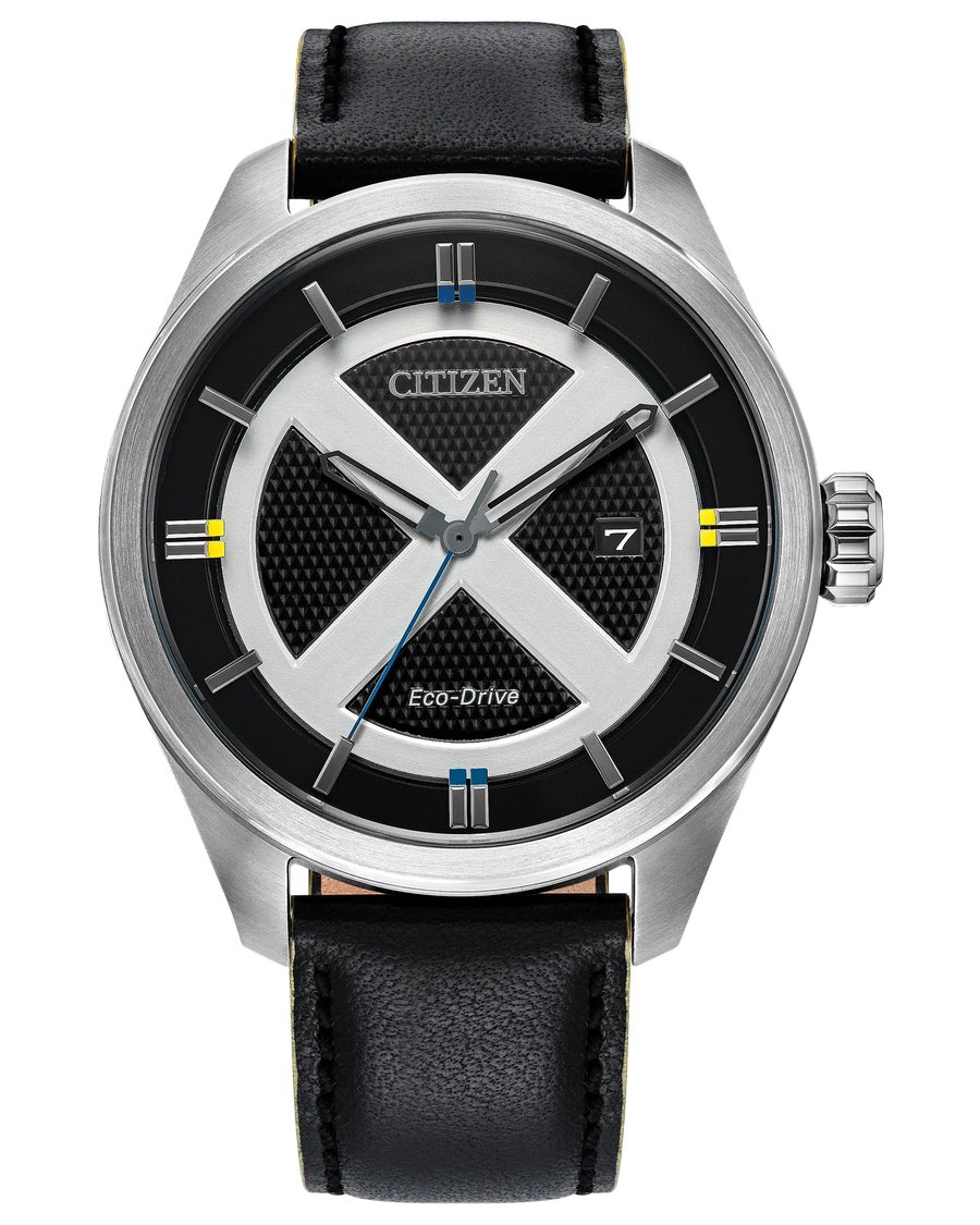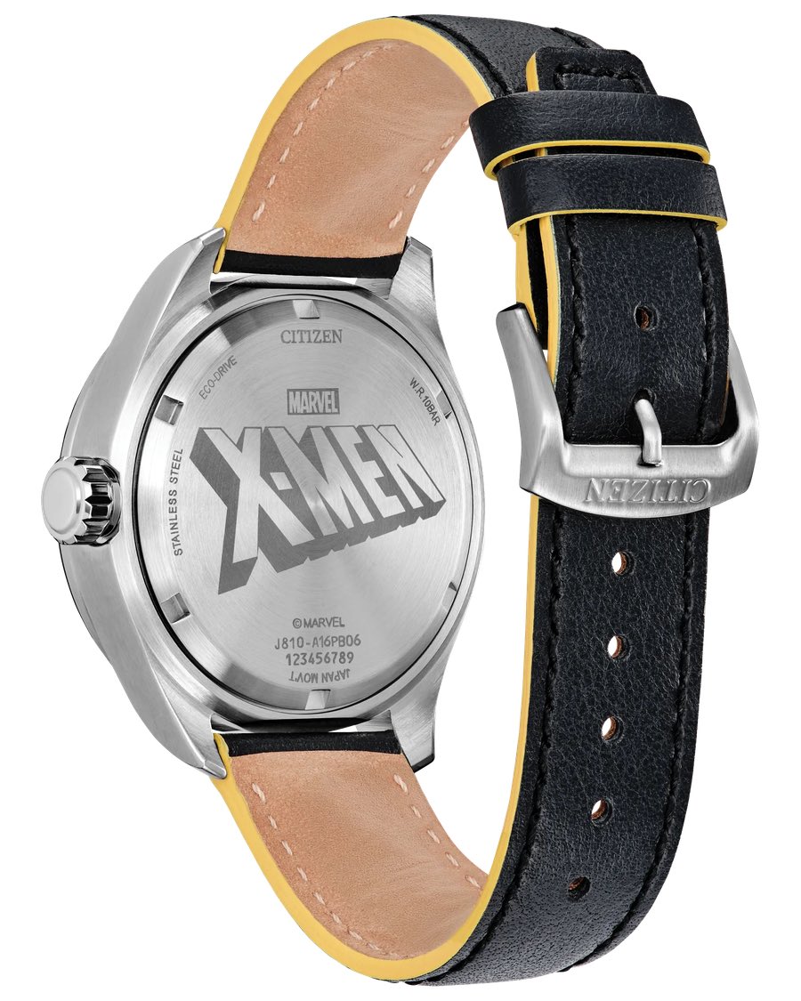 A kétrétegű fekete számlapon egy nagy ezüst "X" betű látható egy ezüst gyűrű közepén. Az X-Men eredeti Kék és Arany csapatára is van egy finom utalás, ami a kékkel hangsúlyozott 12 órás és 6 órás órajeleken, valamint az aranyszínű 3 órás és 9 órás indexeken látható. A textúrált fekete bőrszíj sárga szegélyes részletekkel és a rozsdamentes acél tokfedélbe vésett X-Men logó teszi teljessé az általános esztétikát. Az óra egy különleges Citizen x Marvel tematikájú csomagban érkezik.