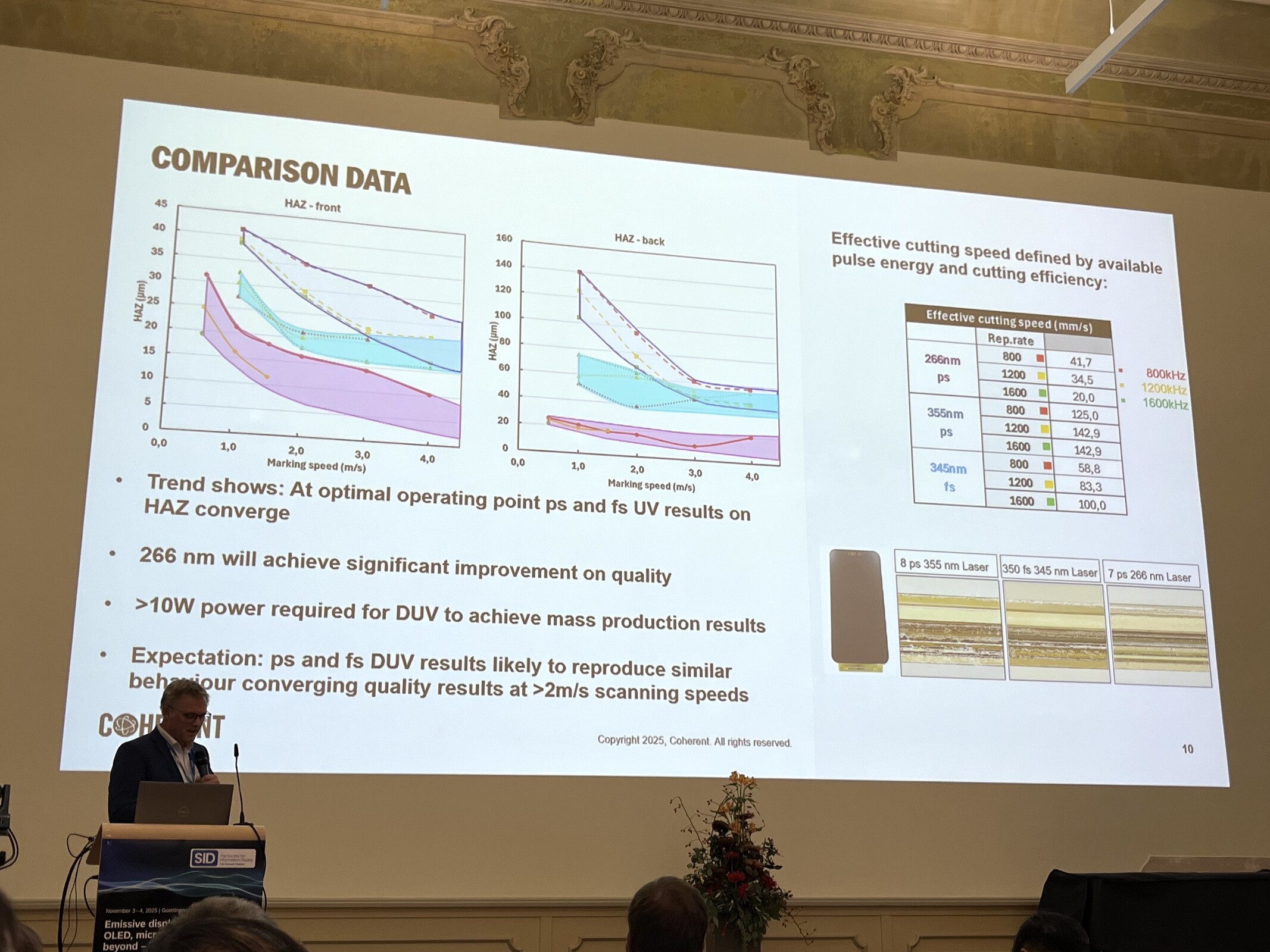 A Coherent lézereket használ, és célja a folyamat további optimalizálása, hogy végül keret nélküli kijelzőket lehessen vágni. Az elmúlt években ezek a kijelzőszegélyek vékonyabbá váltak, mivel egyes gyártók behajtották a kijelzőszéleket, hogy legalább a keret nélküli képernyő látszatát keltsék. Az anyag azonban még mindig megszakad a szélénél, amit aztán egy keret takar. Ez is segít megvédeni a kijelzőt, mivel ezeken a széleken a kijelzőrétegek potenciálisan elkezdhetnek elválni egymástól.