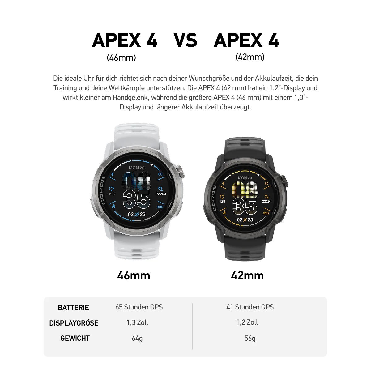 Mérettől függően 1,3 hüvelykes vagy 1,2 hüvelykes MIP-képernyővel rendelkezik, ami állítólag közvetlen napfényben is könnyű leolvasást tesz lehetővé. Az akkumulátor élettartama a tevékenységek rögzítésekor 65 vagy 41 órában van megadva, ami elegendőnek kell lennie az ultramaratonokhoz. Összehasonlításképpen, a Apple Watch Series 9 mindössze 1,5 nap után lemerül tipikus használat mellett, GPS nélkül és mindig bekapcsolt kijelzővel. Az alvásfigyelés, a pulzusszám-változékonyság (mint így a regenerálódás) és az oxigéntelítettség is nyomon követhető. Végül pedig a keret titánból készült