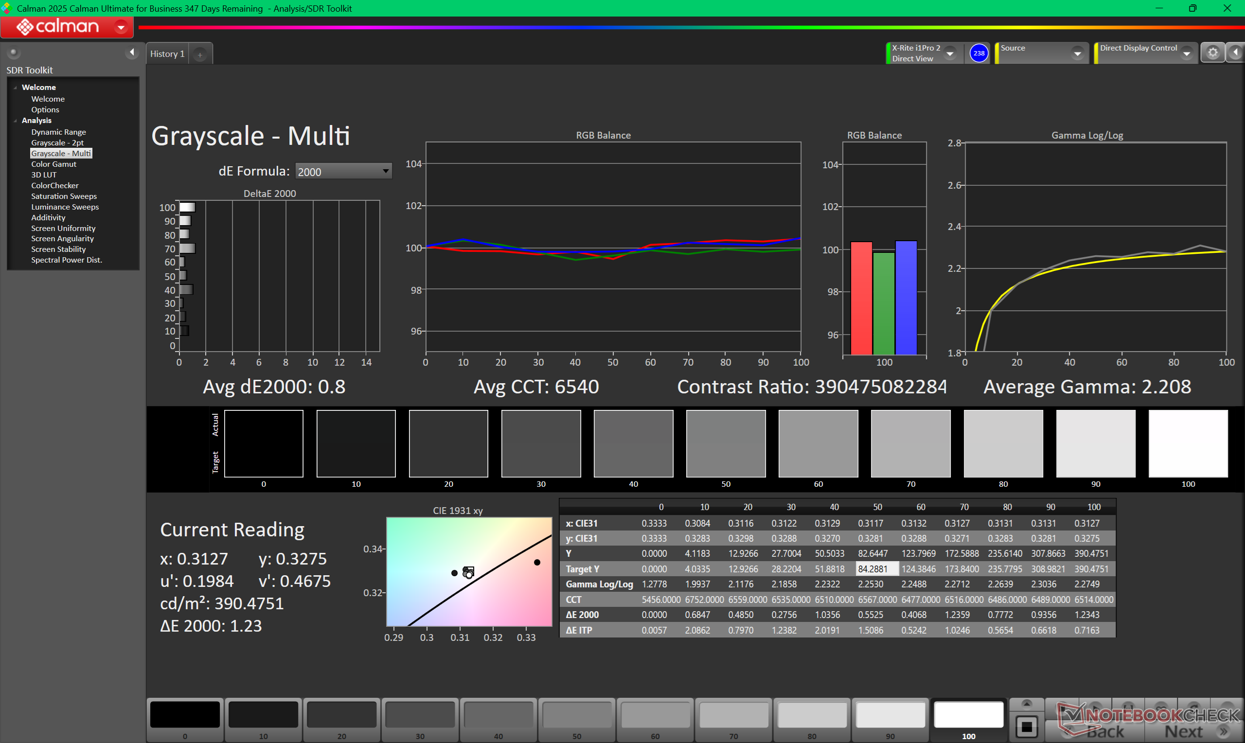 A kijelző jól kalibrált, átlagos szürkeárnyalatos és színes deltaE értékek 2 vagy annál kisebb értékekkel. A panel további kalibrálása a színmérőnkkel csak kis mértékben javítaná a színeket.