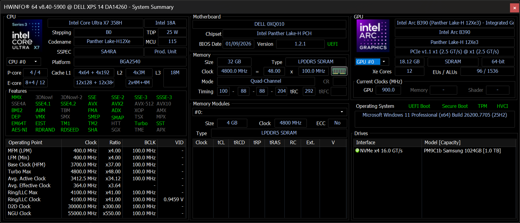 | Dell XPS 14 Core Ultra X7 358H Intel Core Ultra X7 358H ⎘ Intel Arc B390 12 Xe3 Panther Lake iGPU ⎘ 32 GB Memória, 1000 GB SSD | Amazon: List Price: 2200 USD | 1.4 kg | 15.2 mm | 14.00" 2880x1800 243 PPI OLED | |