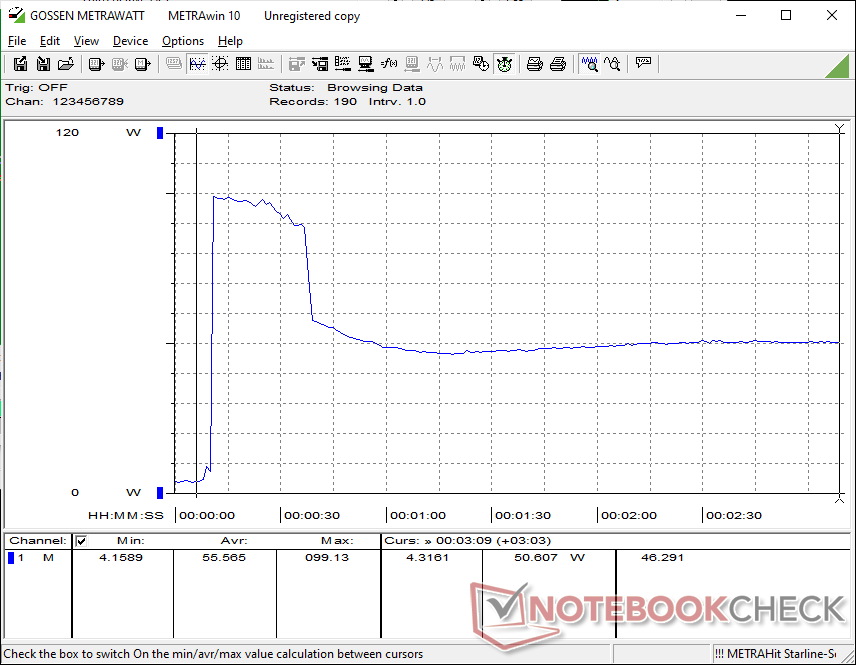 A kis méretű (~10,2 x 5,5 x 2,2 cm) 100 W-os USB-C hálózati adapterrel 102 W-os ideiglenes maximális fogyasztást tudunk rögzíteni, amikor a CPU teljesen ki van terhelve, ami jóval magasabb, mint a 2025 XPS 14-nél hasonló körülmények között. A magasabb teljesítményplafon a Panther Lake-H magasabb Turbo Boost plafonját példázza az Arrow Lake-H-hoz képest.