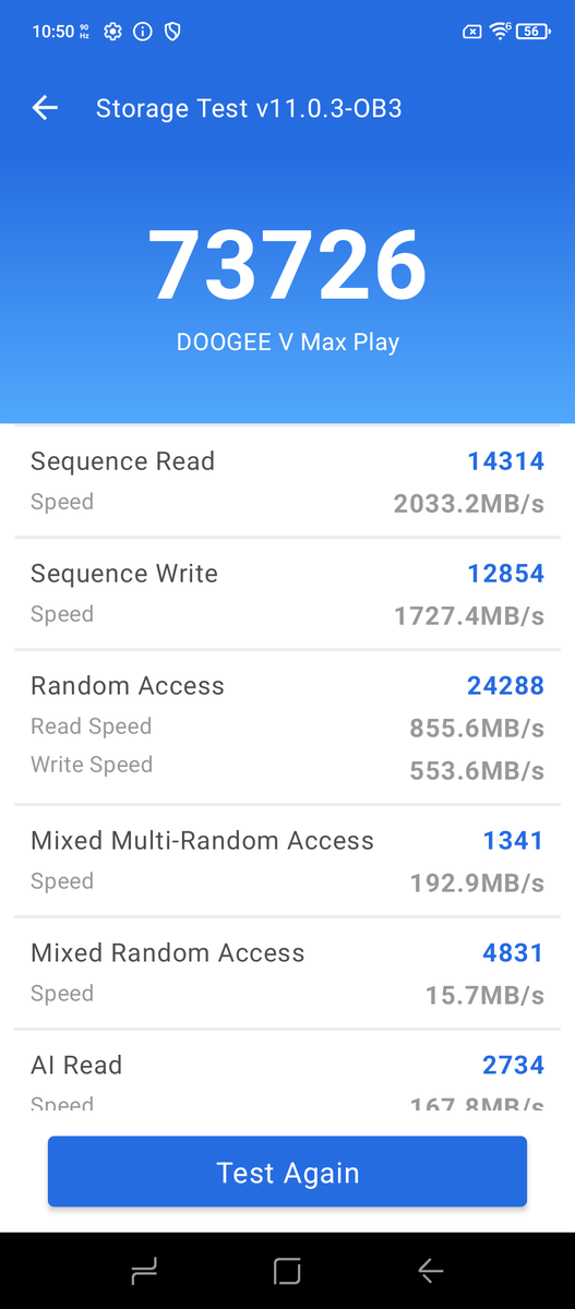 Az 512 GB-os tárolóchip lenyűgözően gyors, ~2 GB/s-os szekvenciális olvasási sebességgel. A 16 GB RAM és az alkalmazott SoC is elegendő a legtöbb feladathoz; az AnTuTu úgy véli, hogy a tesztelt V Max Play a Mediatek Dimensity 7300X, ami nem sokban különbözik a Dimensity 7300. Mindkettő 4 "nagy" és 4 "kis" maggal rendelkezik, mérsékelt órajelekkel.