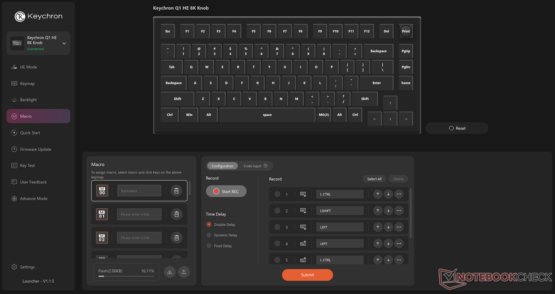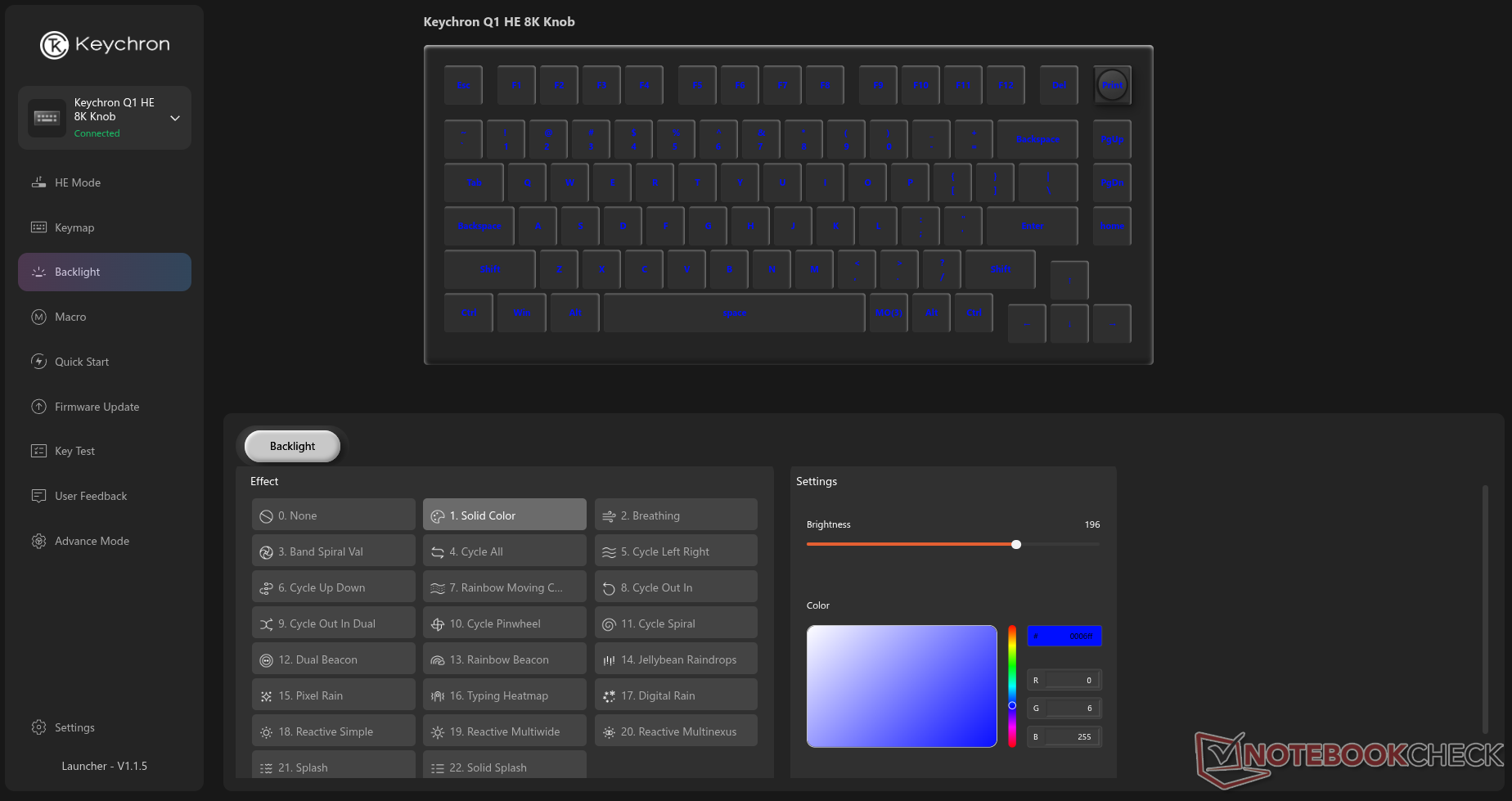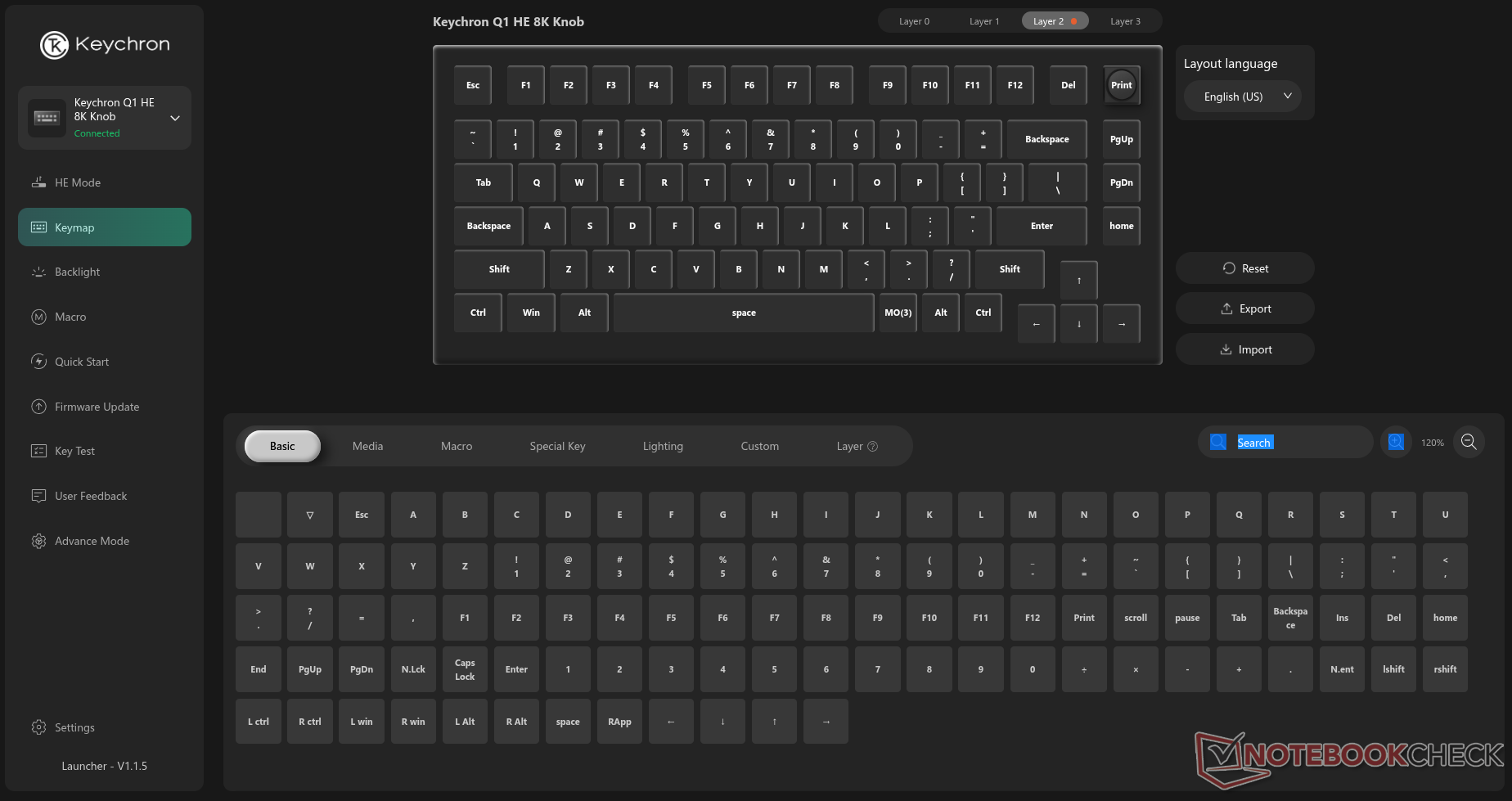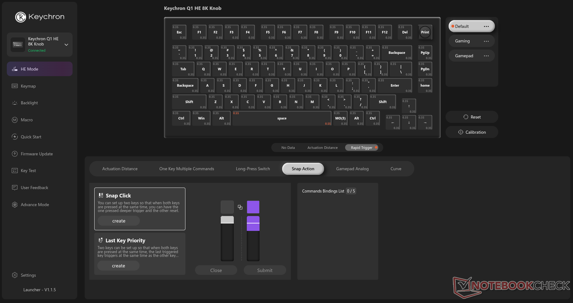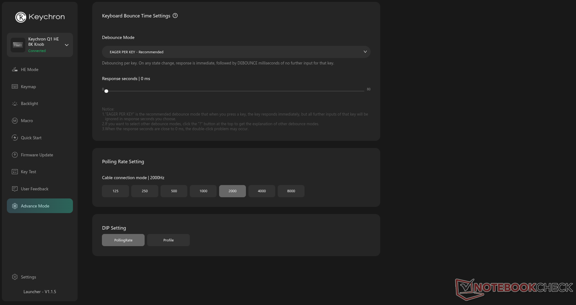 A Keychron Launcher, a Keychron billentyűzetek testreszabásához használt szoftvercsomagot is frissítették a Q1 HE 8K megjelenéséhez, amely tisztább felhasználói felületet kínál a különböző Hall effektusú játékfunkciókhoz. A Keychron a Q1 HE 8K fedélzeti memóriáját is 1 MB-ra frissítette, ami azt jelenti, hogy lényegesen több makró és testreszabási lehetőség tárolására képes.