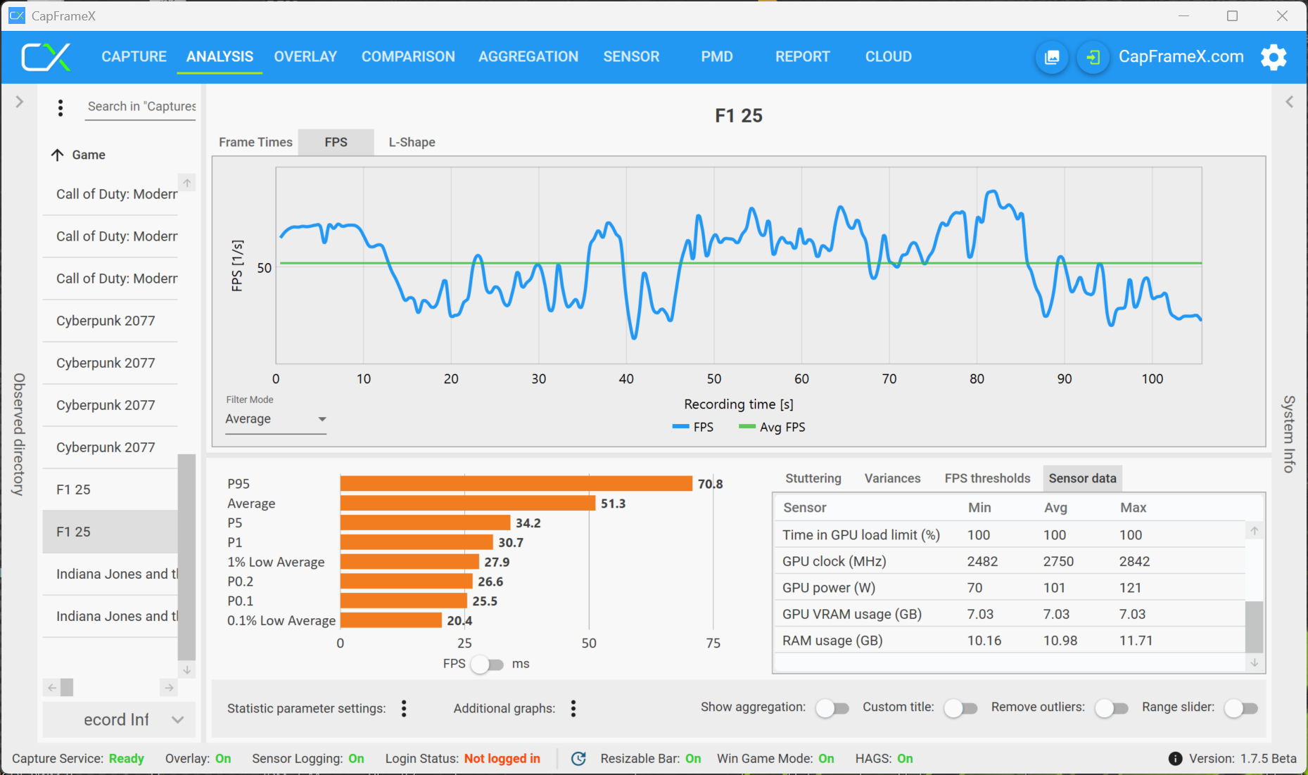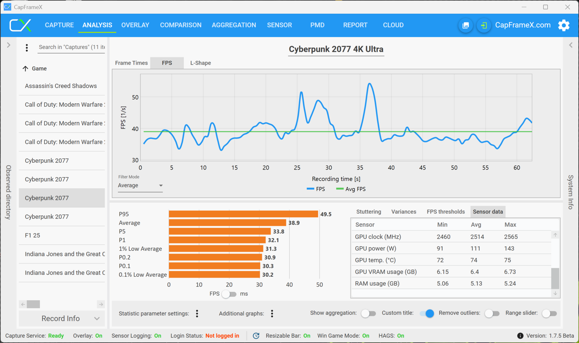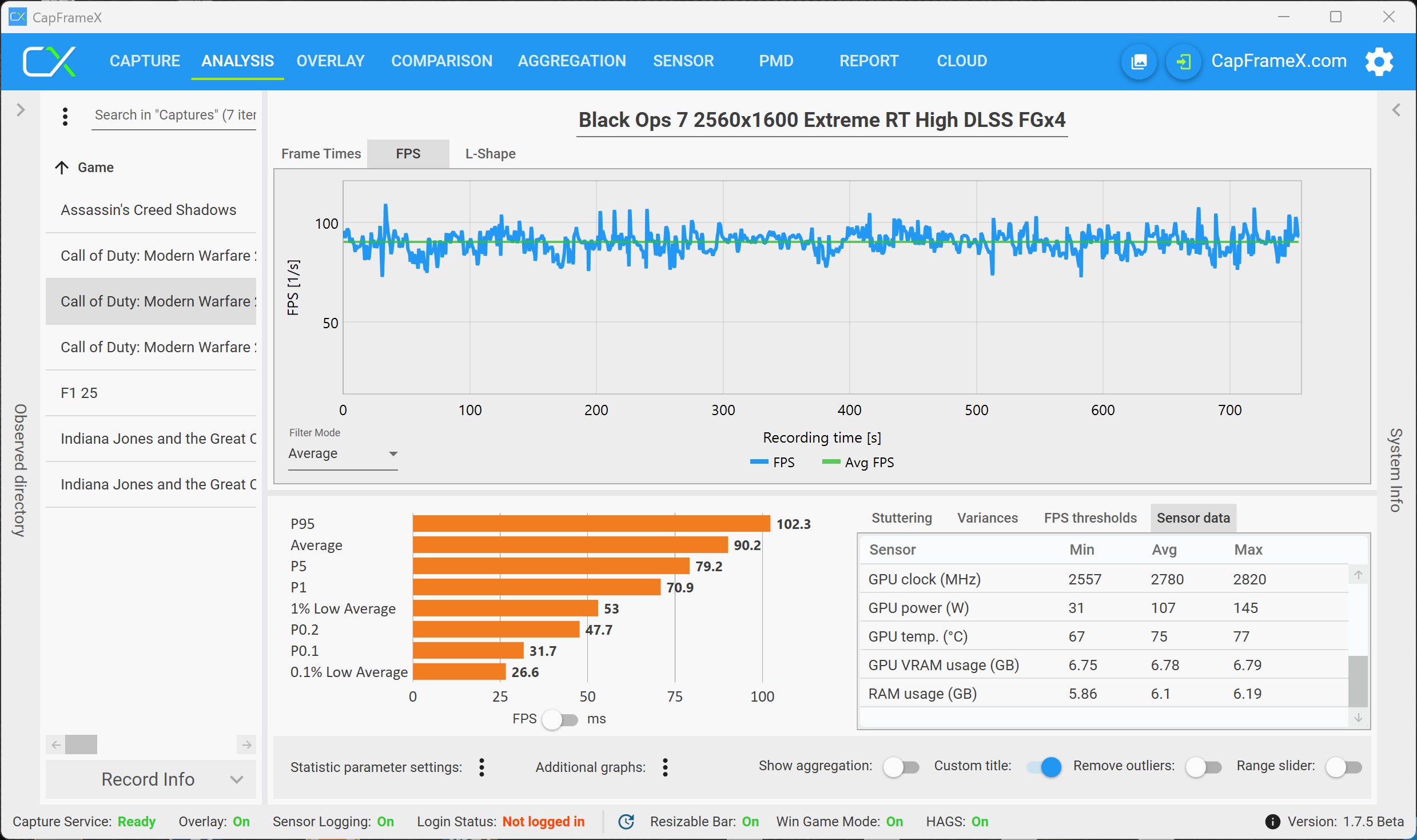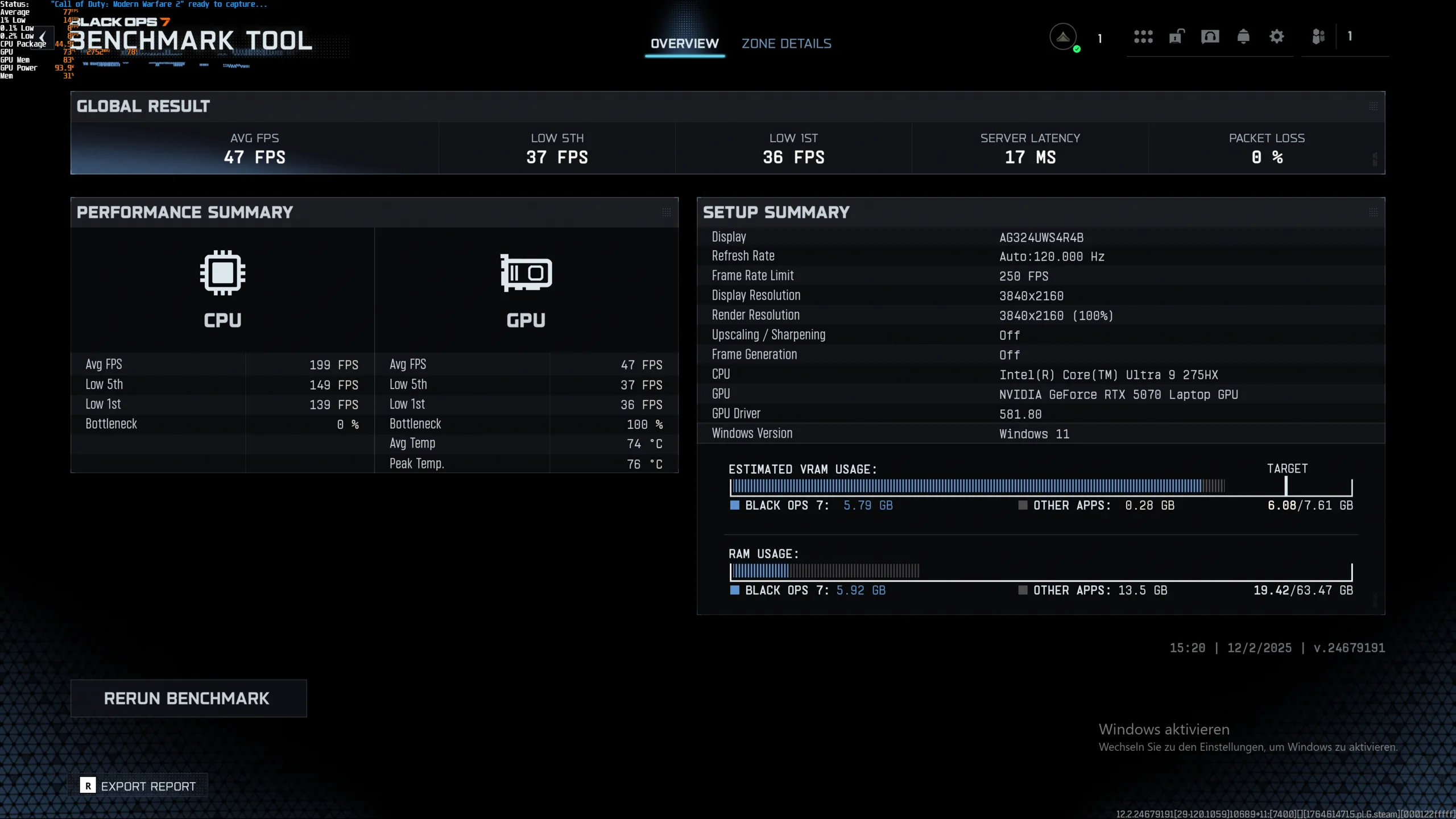 Az a tény, hogy van VRAM figyelmeztetés, azonban nem jelenti azt, hogy feltétlenül problémákat tapasztalsz játék közben. Az RTX 5070 maximális terhelésével (legnagyobb VRAM terhelés, de még így is simán játszható), 2560 x 1600 pixeles beállítással, Raytracing (High), DLSS és Frame Generation (QHD RT nem játszható DLSS nélkül, ugyanakkor 4K RT-vel nem mindig 30 fps fölött van, hiába DLSS és MFGx4) és játszottunk a multiplayerrel. Az alábbi elemzés példaként egy többjátékos meccset mutat, és egyértelműen látszik, hogy nincsenek korlátok. Az RTX 5070 Ti 12 GB VRAM-mal nem okoz gondot a 4K felbontás.
