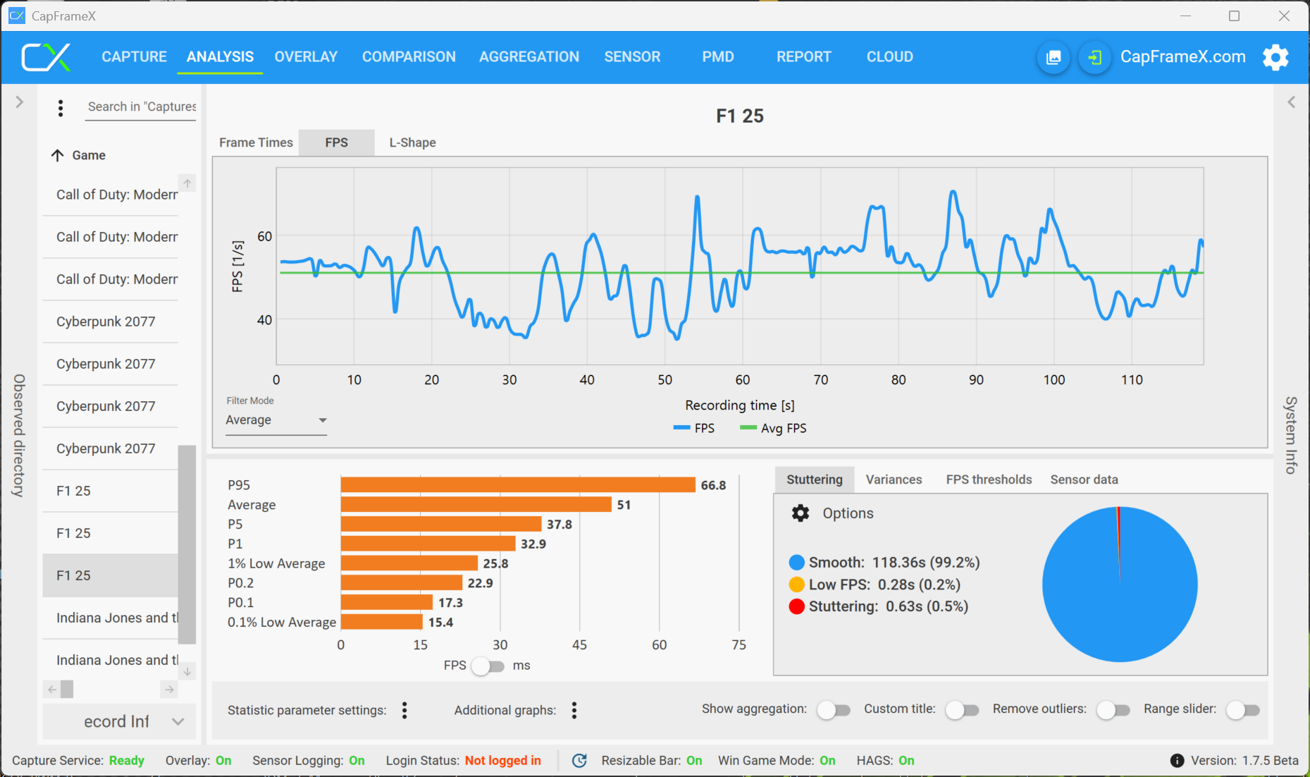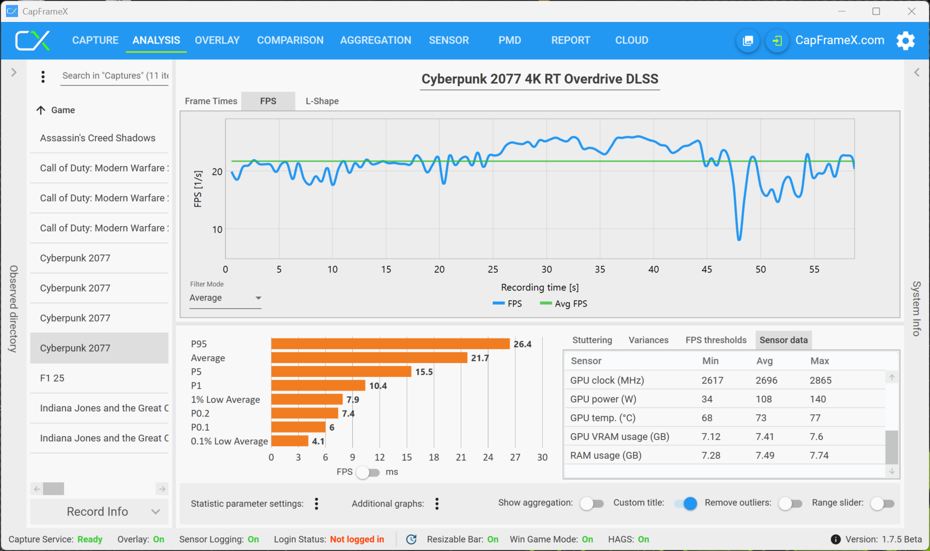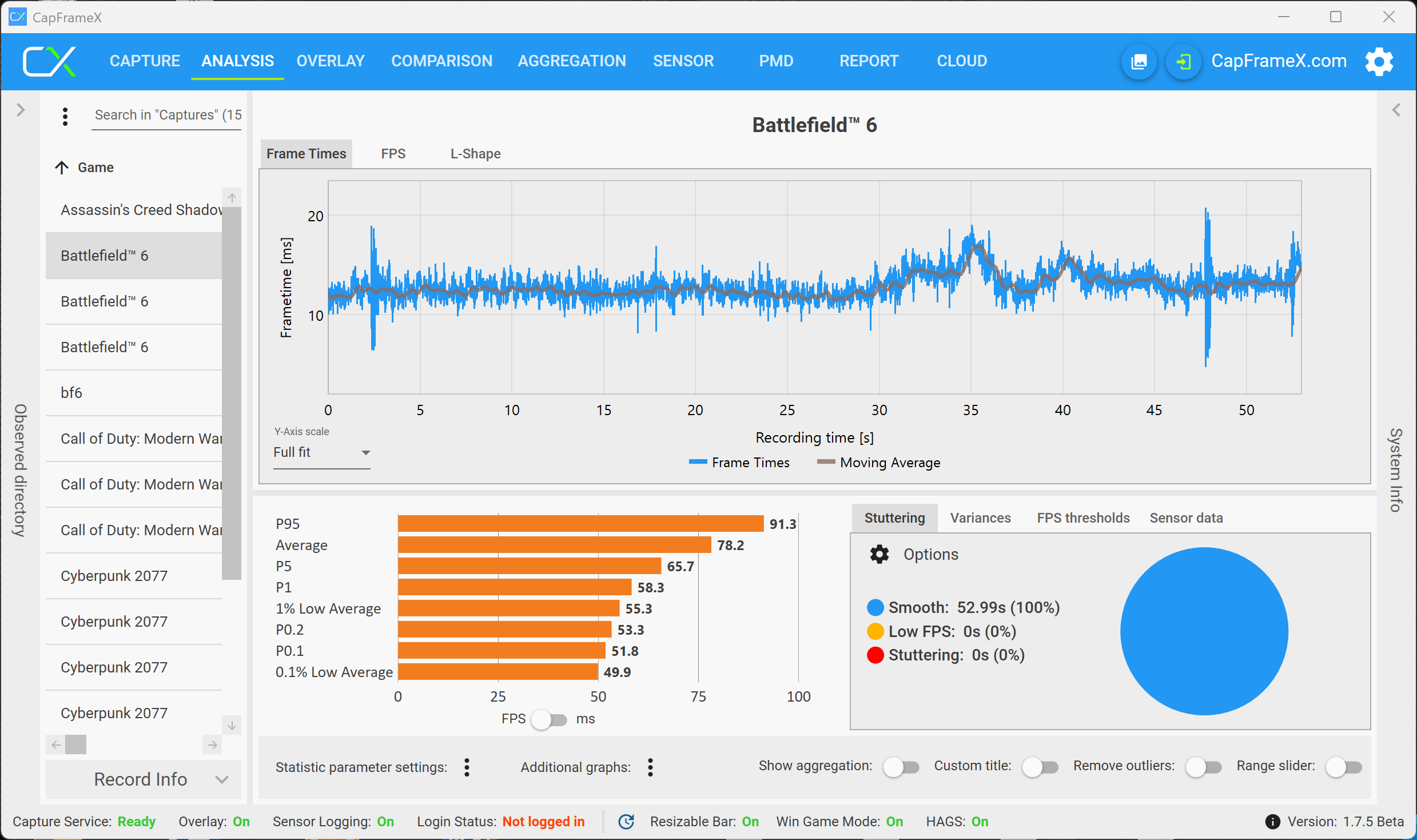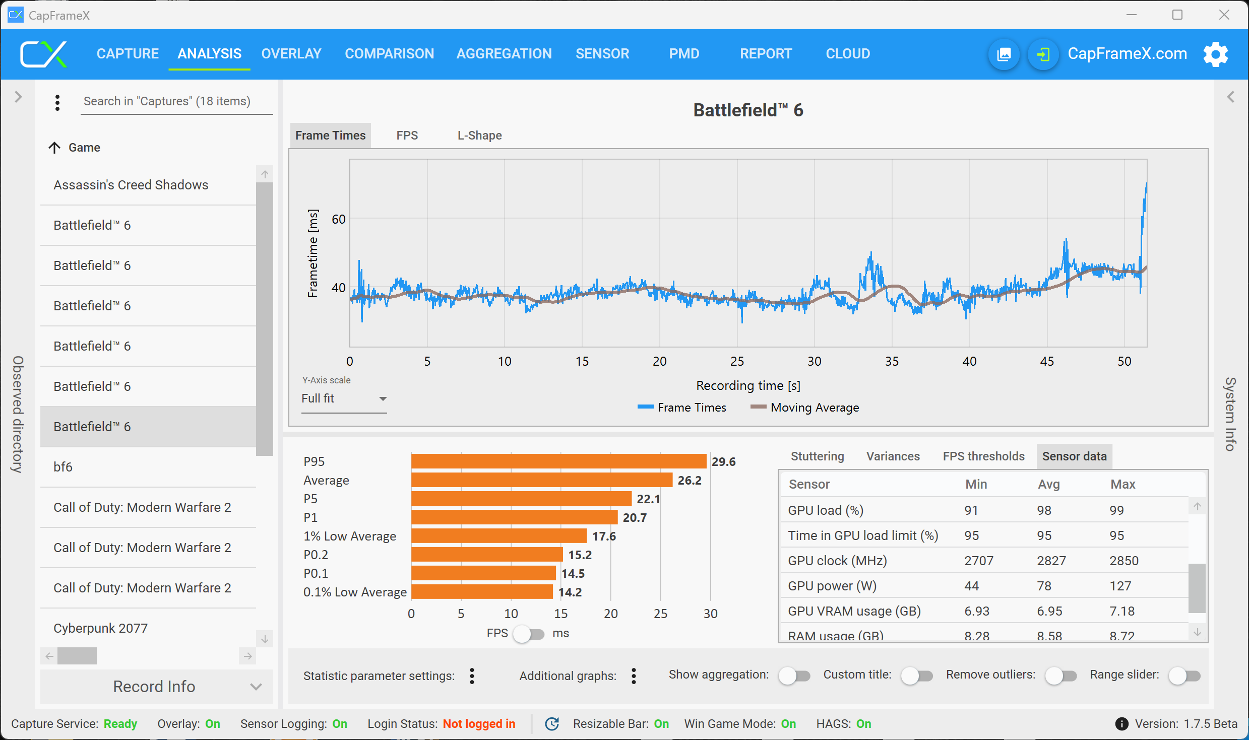 Az a tény, hogy van VRAM figyelmeztetés, azonban nem jelenti azt, hogy feltétlenül problémákat tapasztalsz játék közben. Az RTX 5070 maximális terhelésével (legnagyobb VRAM terhelés, de még így is simán játszható), 2560 x 1600 pixeles beállítással, Raytracing (High), DLSS és Frame Generation (QHD RT nem játszható DLSS nélkül, ugyanakkor 4K RT-vel nem mindig 30 fps fölött van, hiába DLSS és MFGx4) és játszottunk a multiplayerrel. Az alábbi elemzés példaként egy többjátékos meccset mutat, és egyértelműen látszik, hogy nincsenek korlátok. Az RTX 5070 Ti 12 GB VRAM-mal nem okoz gondot a 4K felbontás.