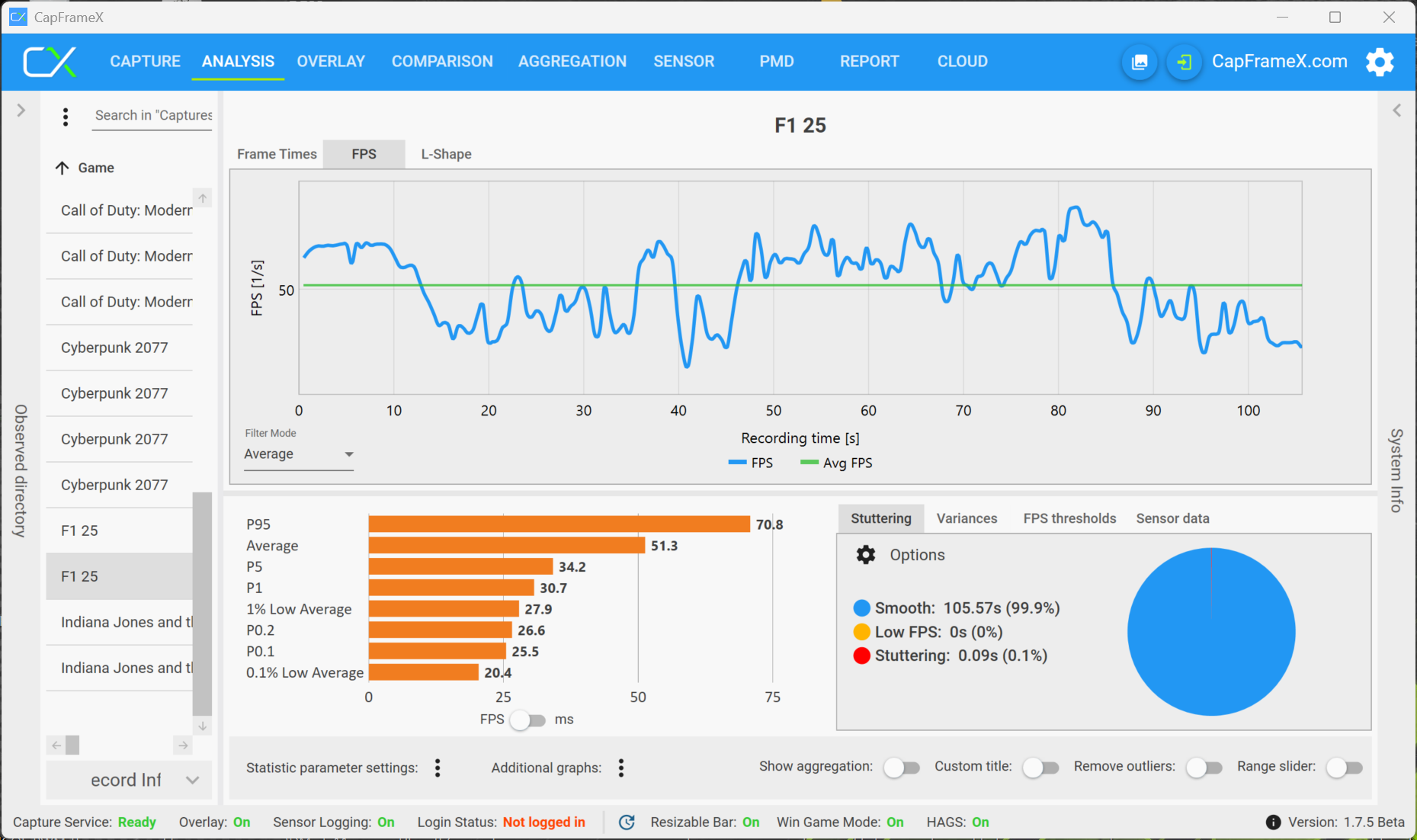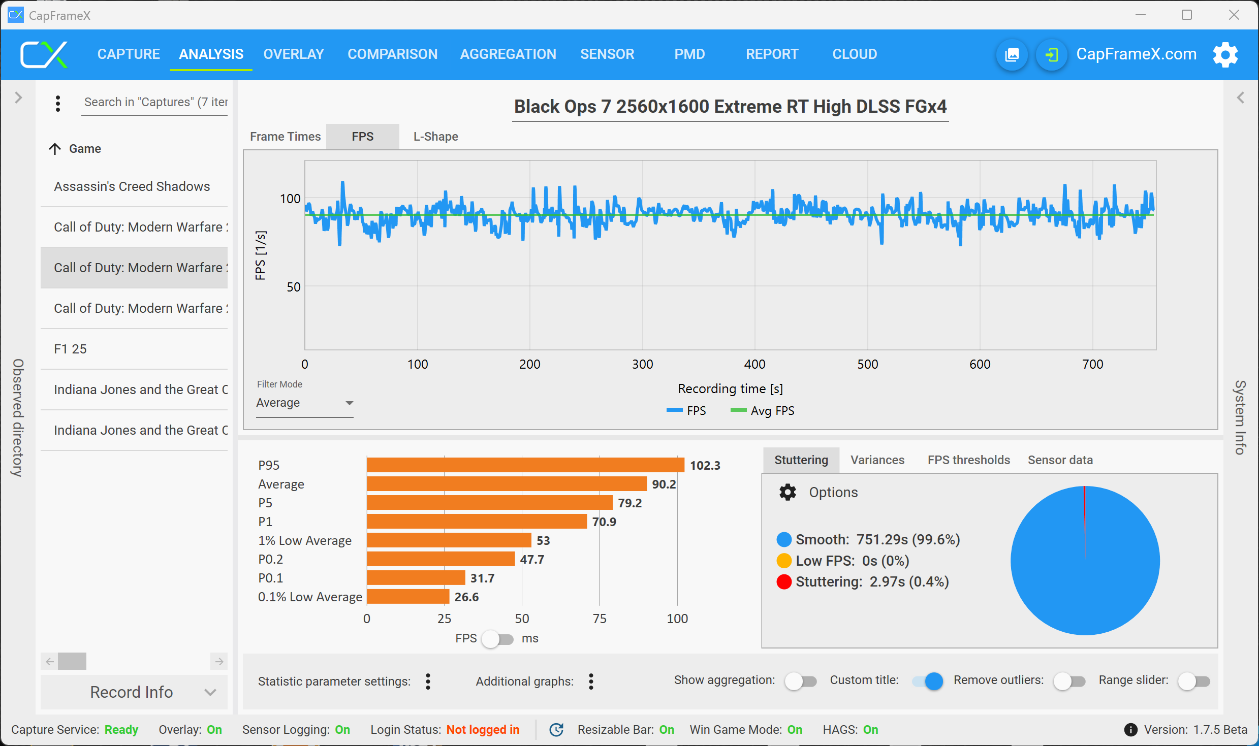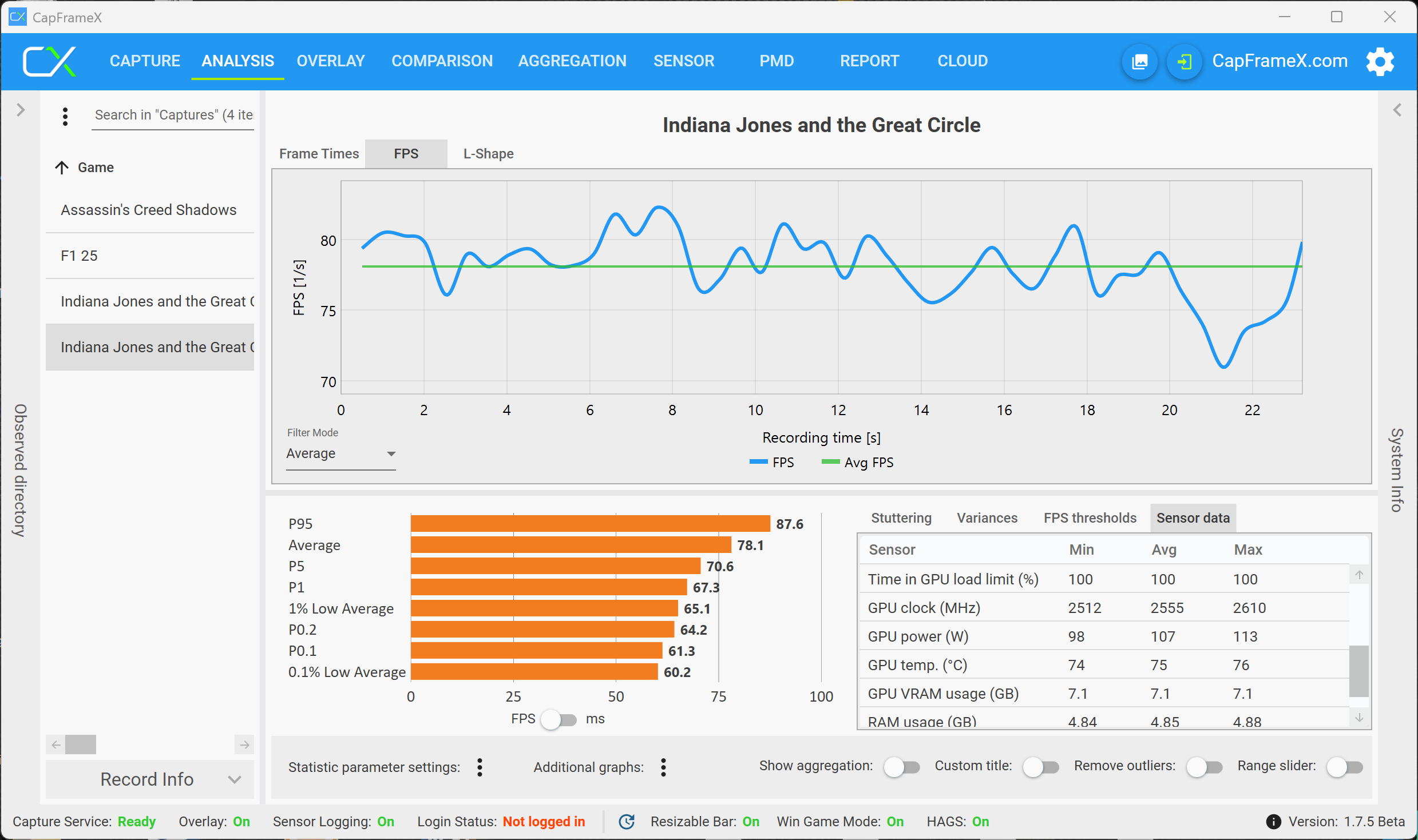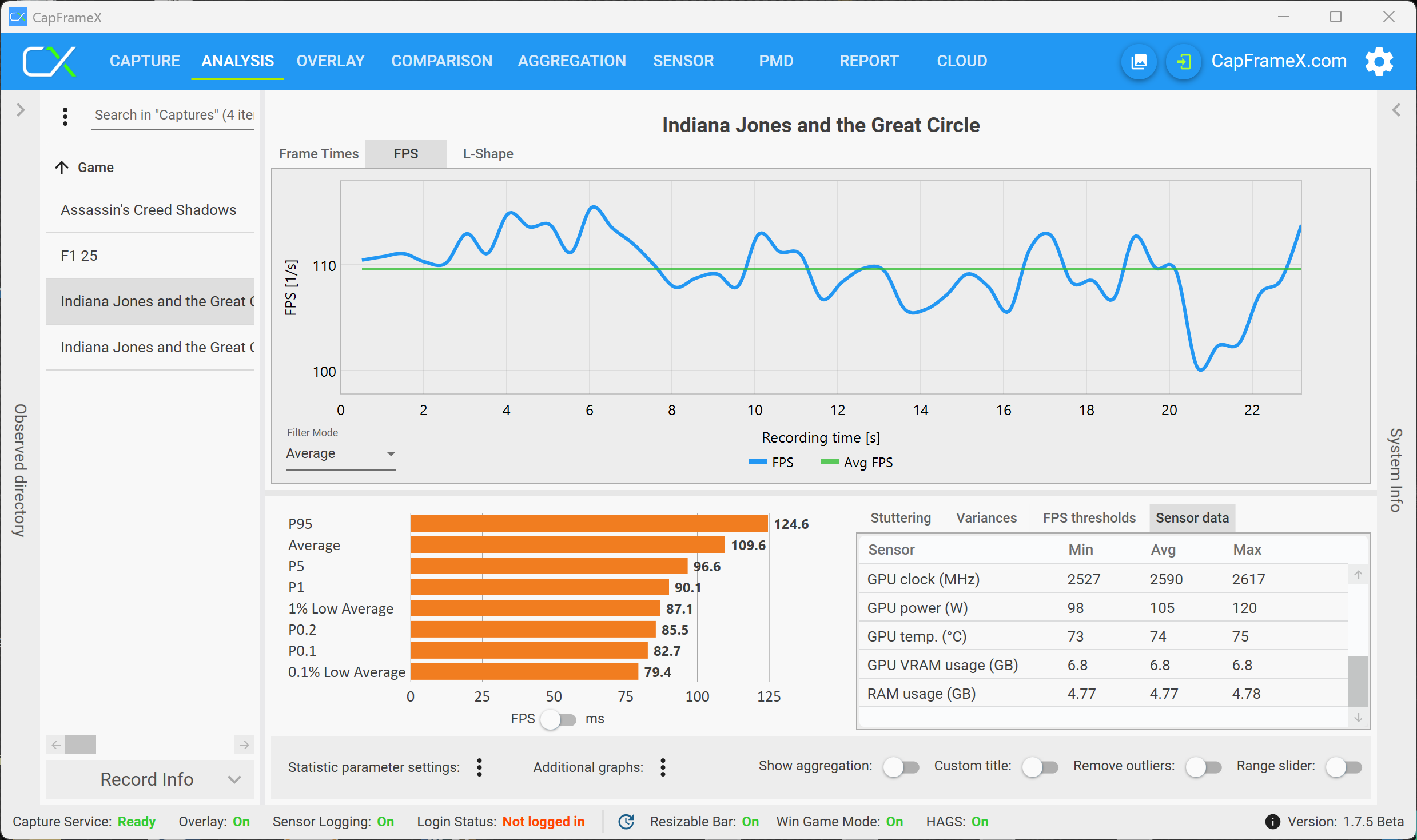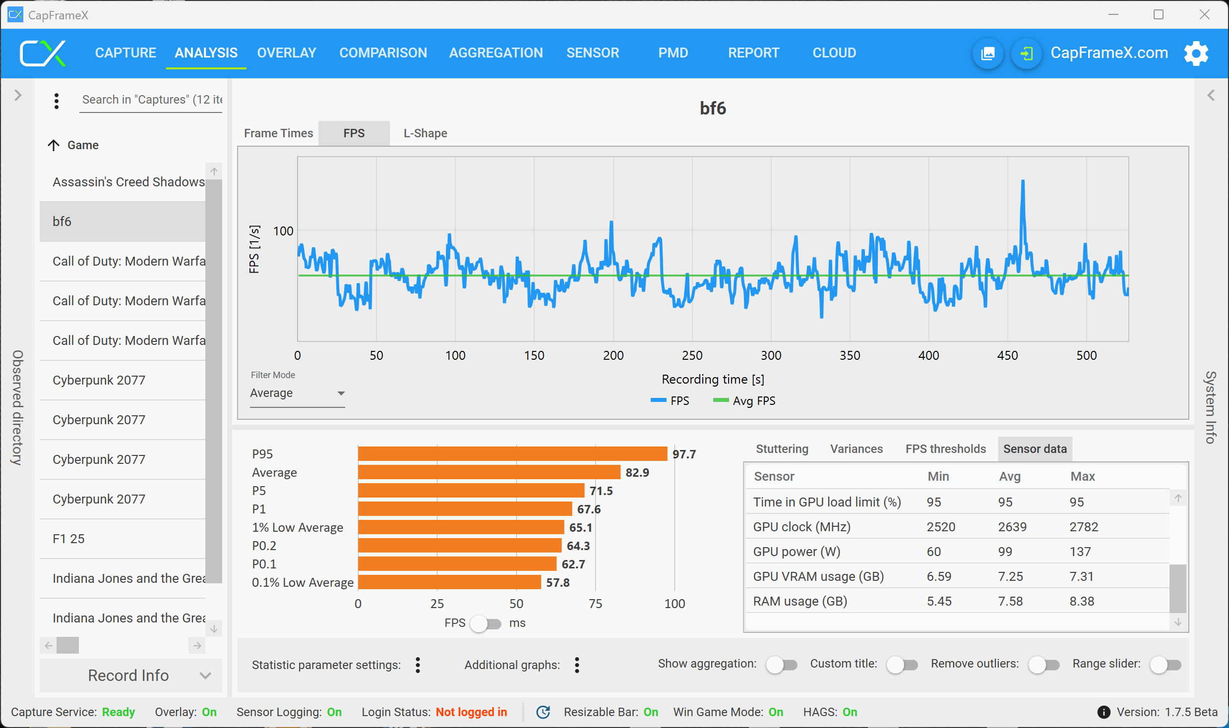 Az a tény, hogy van VRAM figyelmeztetés, azonban nem jelenti azt, hogy feltétlenül problémákat tapasztalsz játék közben. Az RTX 5070 maximális terhelésével (legnagyobb VRAM terhelés, de még így is simán játszható), 2560 x 1600 pixeles beállítással, Raytracing (High), DLSS és Frame Generation (QHD RT nem játszható DLSS nélkül, ugyanakkor 4K RT-vel nem mindig 30 fps fölött van, hiába DLSS és MFGx4) és játszottunk a multiplayerrel. Az alábbi elemzés példaként egy többjátékos meccset mutat, és egyértelműen látszik, hogy nincsenek korlátok. Az RTX 5070 Ti 12 GB VRAM-mal nem okoz gondot a 4K felbontás.