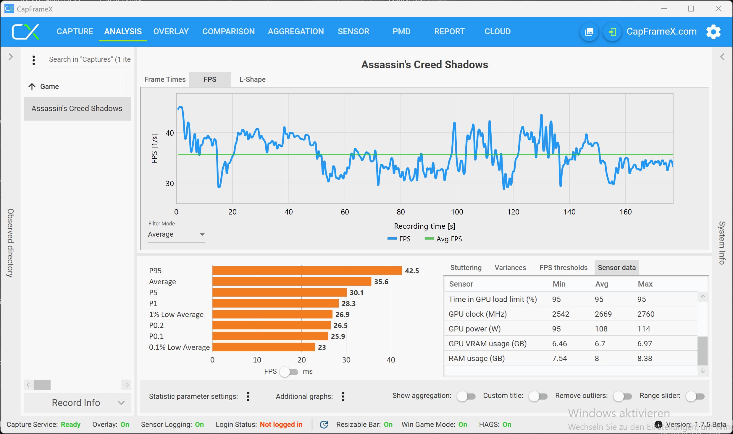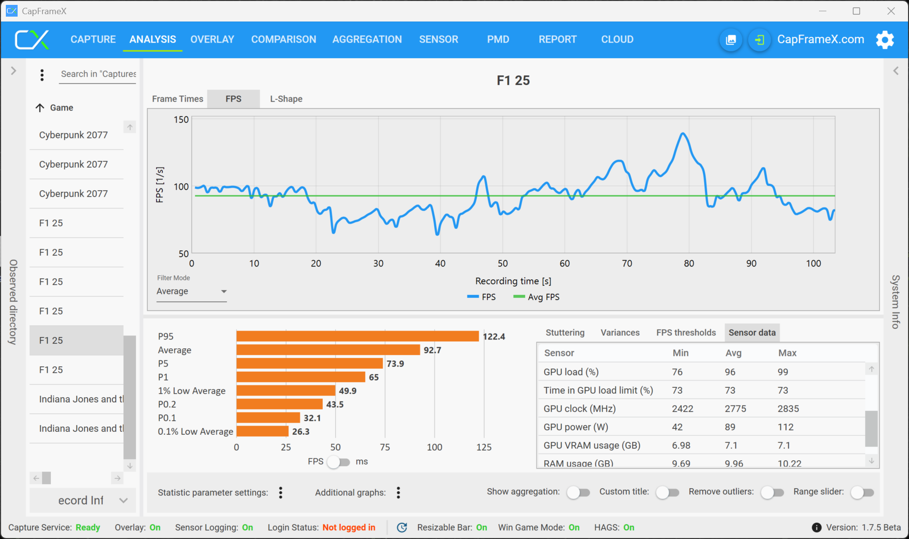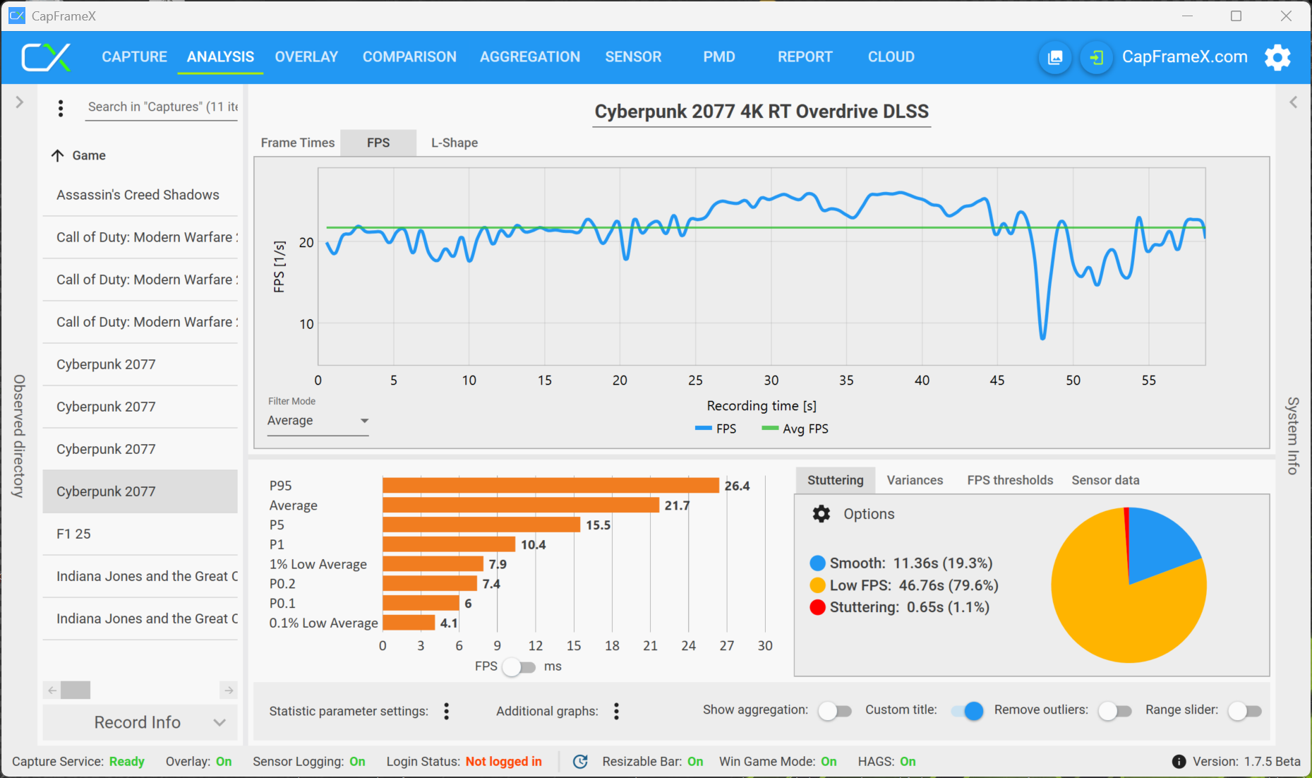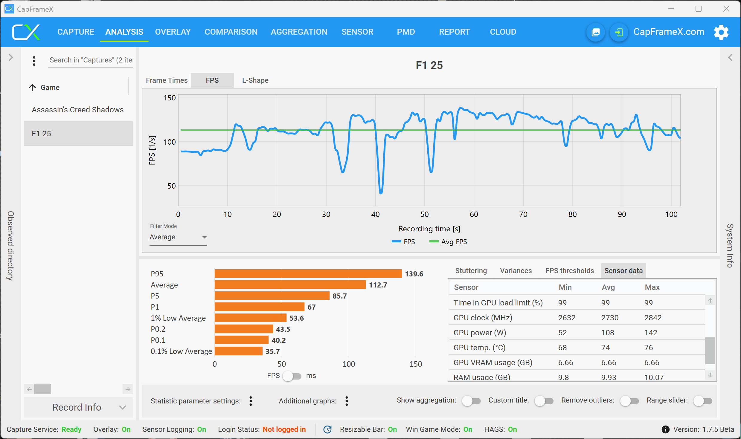 Az a tény, hogy van VRAM figyelmeztetés, azonban nem jelenti azt, hogy feltétlenül problémákat tapasztalsz játék közben. Az RTX 5070 maximális terhelésével (legnagyobb VRAM terhelés, de még így is simán játszható), 2560 x 1600 pixeles beállítással, Raytracing (High), DLSS és Frame Generation (QHD RT nem játszható DLSS nélkül, ugyanakkor 4K RT-vel nem mindig 30 fps fölött van, hiába DLSS és MFGx4) és játszottunk a multiplayerrel. Az alábbi elemzés példaként egy többjátékos meccset mutat, és egyértelműen látszik, hogy nincsenek korlátok. Az RTX 5070 Ti 12 GB VRAM-mal nem okoz gondot a 4K felbontás.