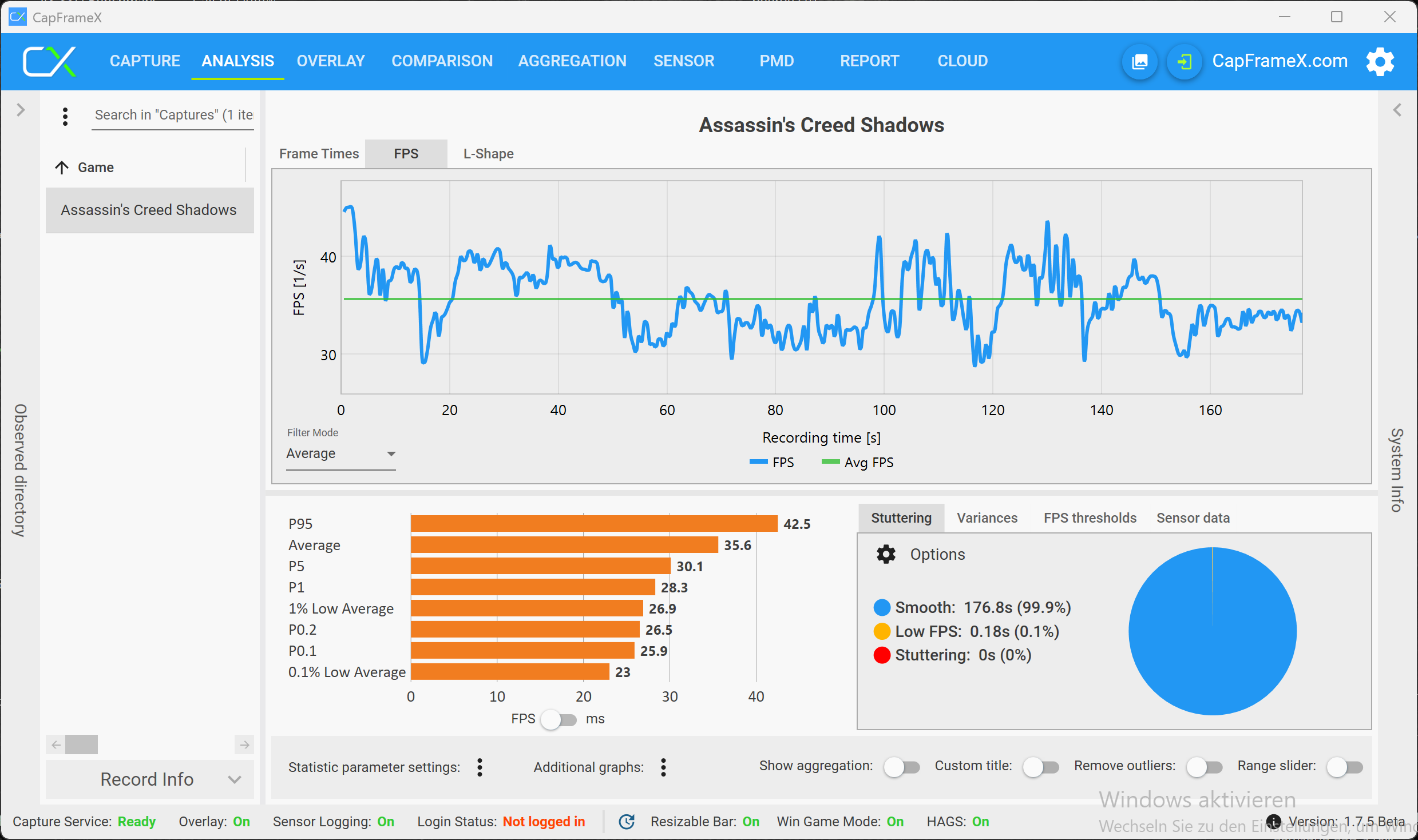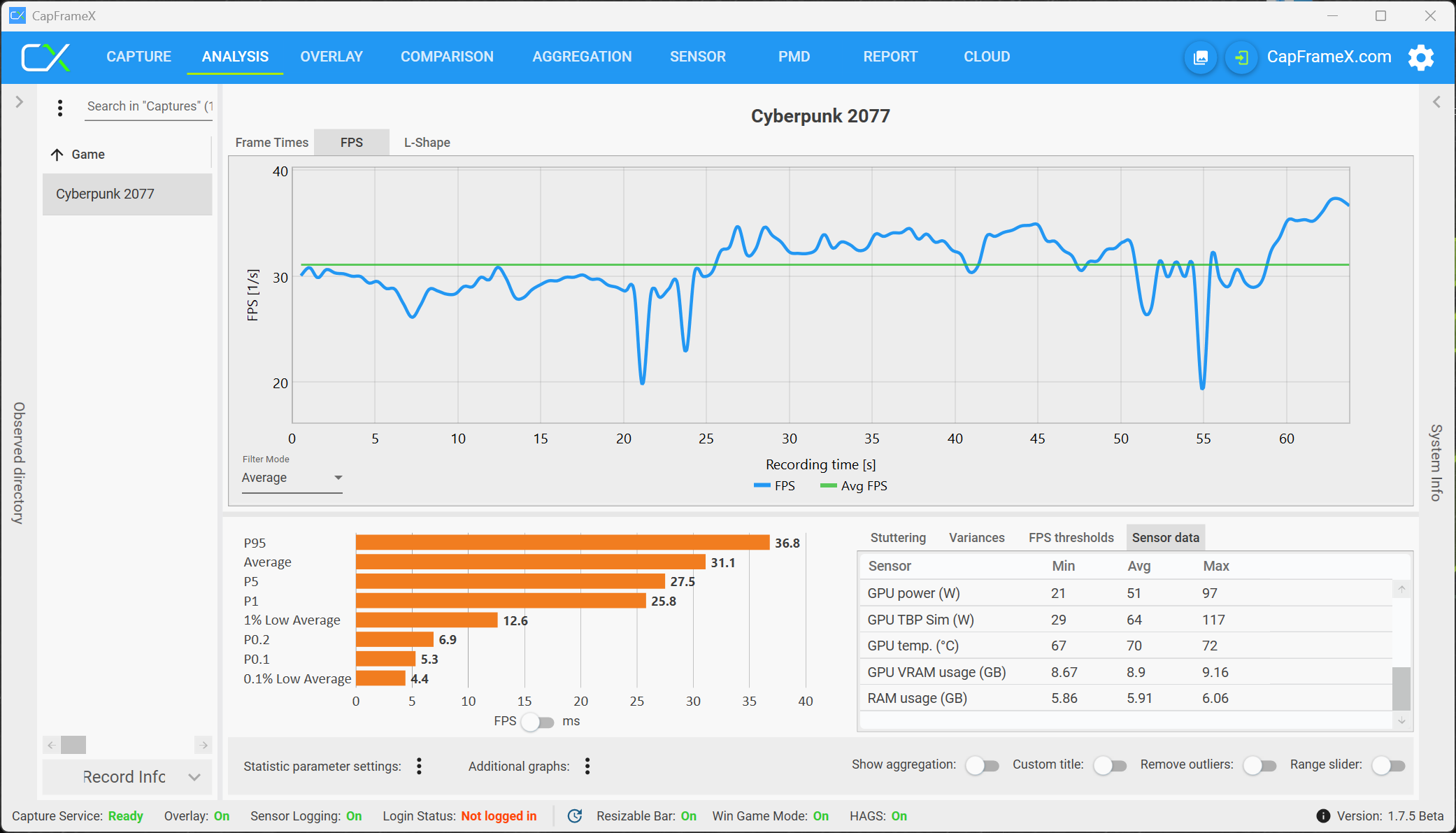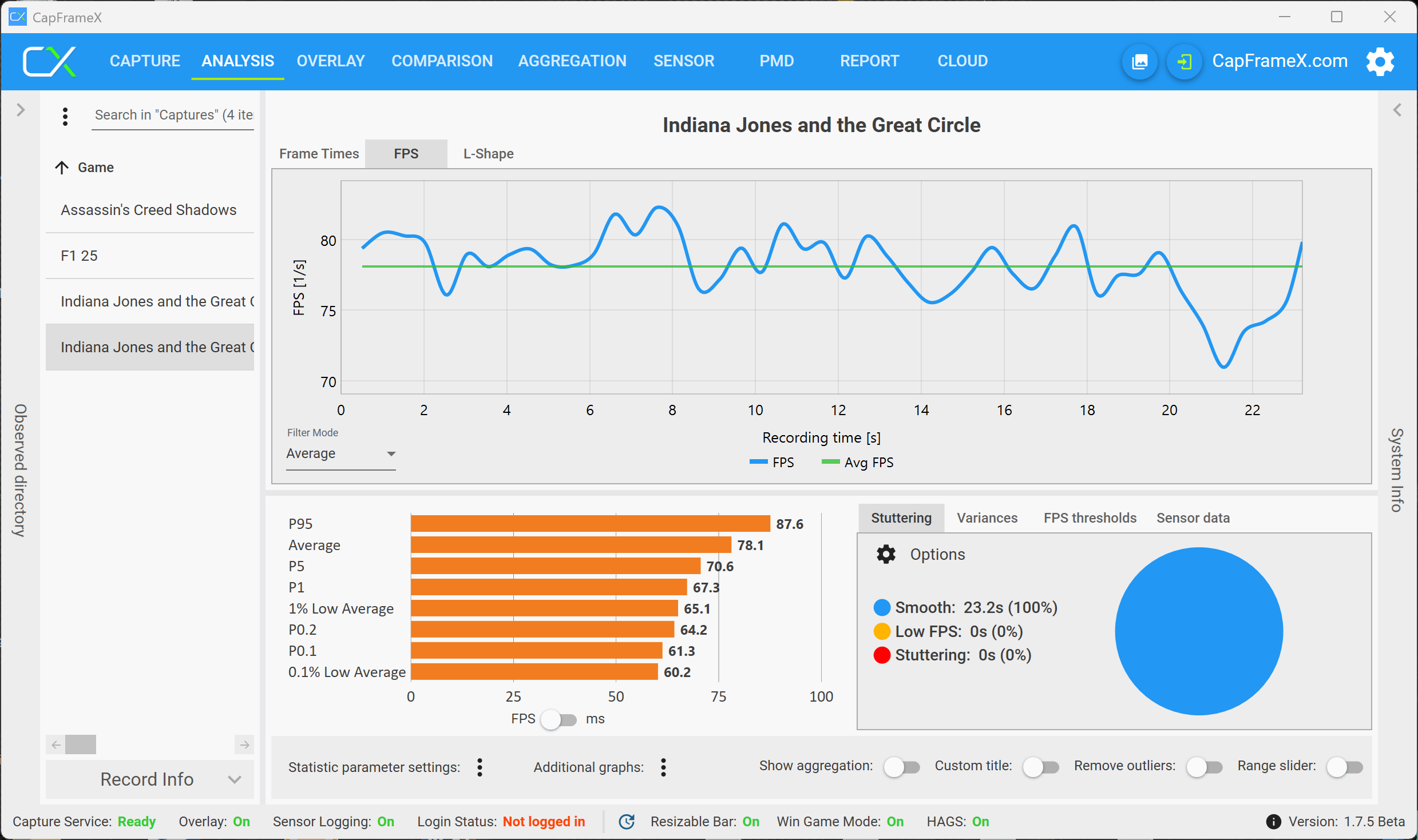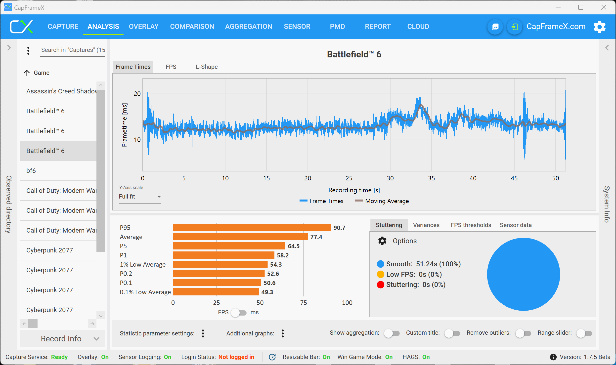 Az a tény, hogy van VRAM figyelmeztetés, azonban nem jelenti azt, hogy feltétlenül problémákat tapasztalsz játék közben. Az RTX 5070 maximális terhelésével (legnagyobb VRAM terhelés, de még így is simán játszható), 2560 x 1600 pixeles beállítással, Raytracing (High), DLSS és Frame Generation (QHD RT nem játszható DLSS nélkül, ugyanakkor 4K RT-vel nem mindig 30 fps fölött van, hiába DLSS és MFGx4) és játszottunk a multiplayerrel. Az alábbi elemzés példaként egy többjátékos meccset mutat, és egyértelműen látszik, hogy nincsenek korlátok. Az RTX 5070 Ti 12 GB VRAM-mal nem okoz gondot a 4K felbontás.