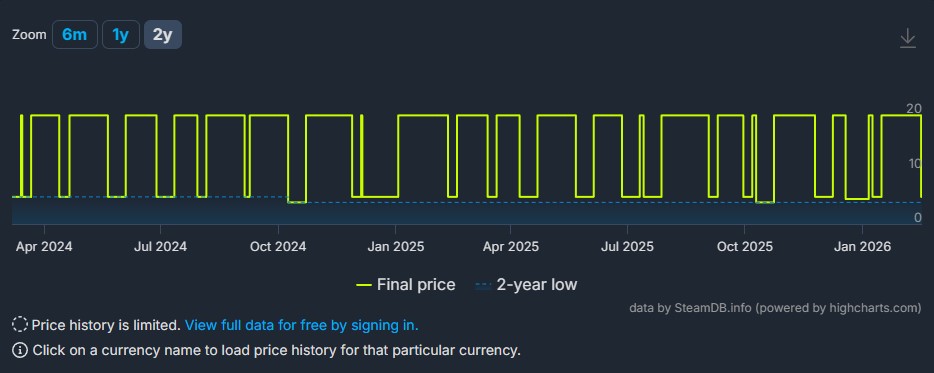 Végül, a 75%-os kedvezmény ellenére az ára tavaly többször is csökkent a SteamDB szerint. És meg kell jegyezni, hogy a legalacsonyabb ára 3,99 dollár volt 2023 júniusában, ami 80%-os kedvezményt jelent.