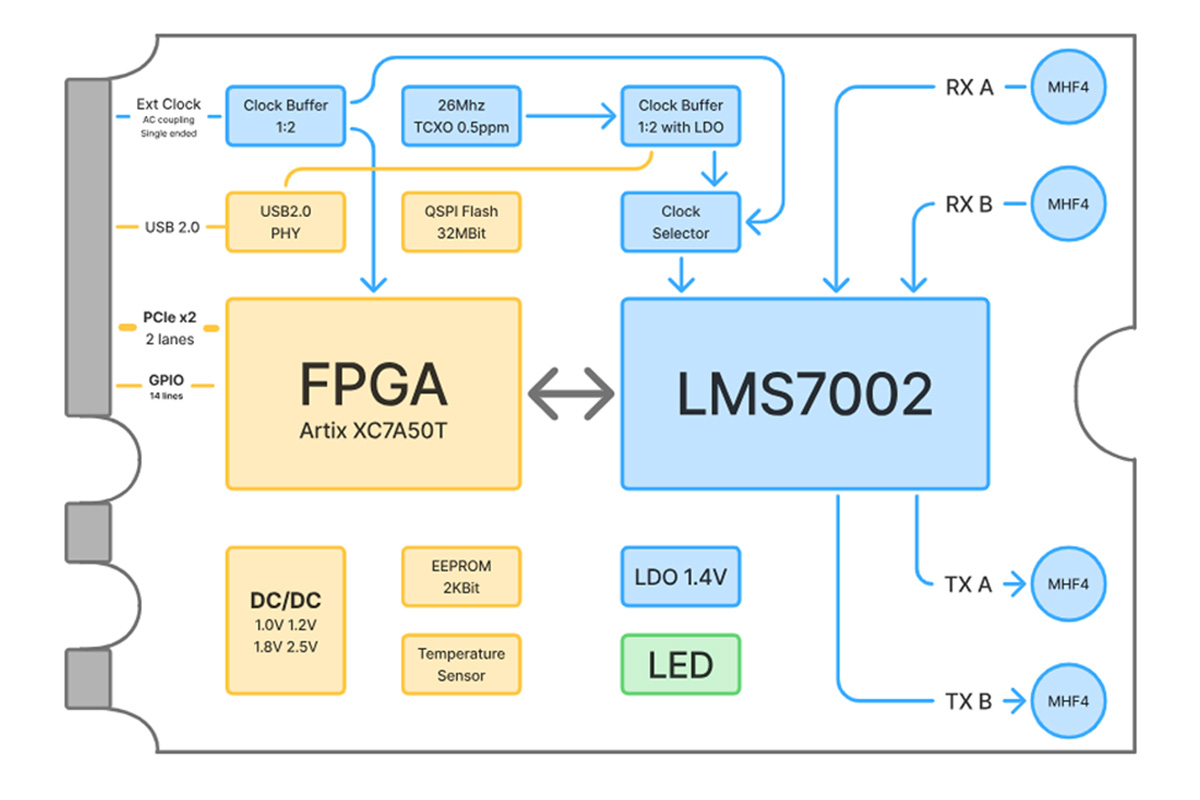 Az xSDR alapját a Lime Microsystems LMS7002M RF adó-vevője képezi, amelyhez egy AMD Artix-7 XC7A50T FPGA párosul. Ez a kombináció 30 MHz és 3,8 GHz közötti hangolási tartományt fed le. Az SDR 0,1 MSPS és 122,88 MSPS közötti mintavételi sebességet támogat SISO üzemmódban és több mint 80 MSPS-t MIMO üzemmódban, 0,5 MHz és 90 MHz közötti csatornasávszélességgel. Négy MHF4 antennacsatlakozó biztosítja a hozzáférést a két RX és két TX csatornához.