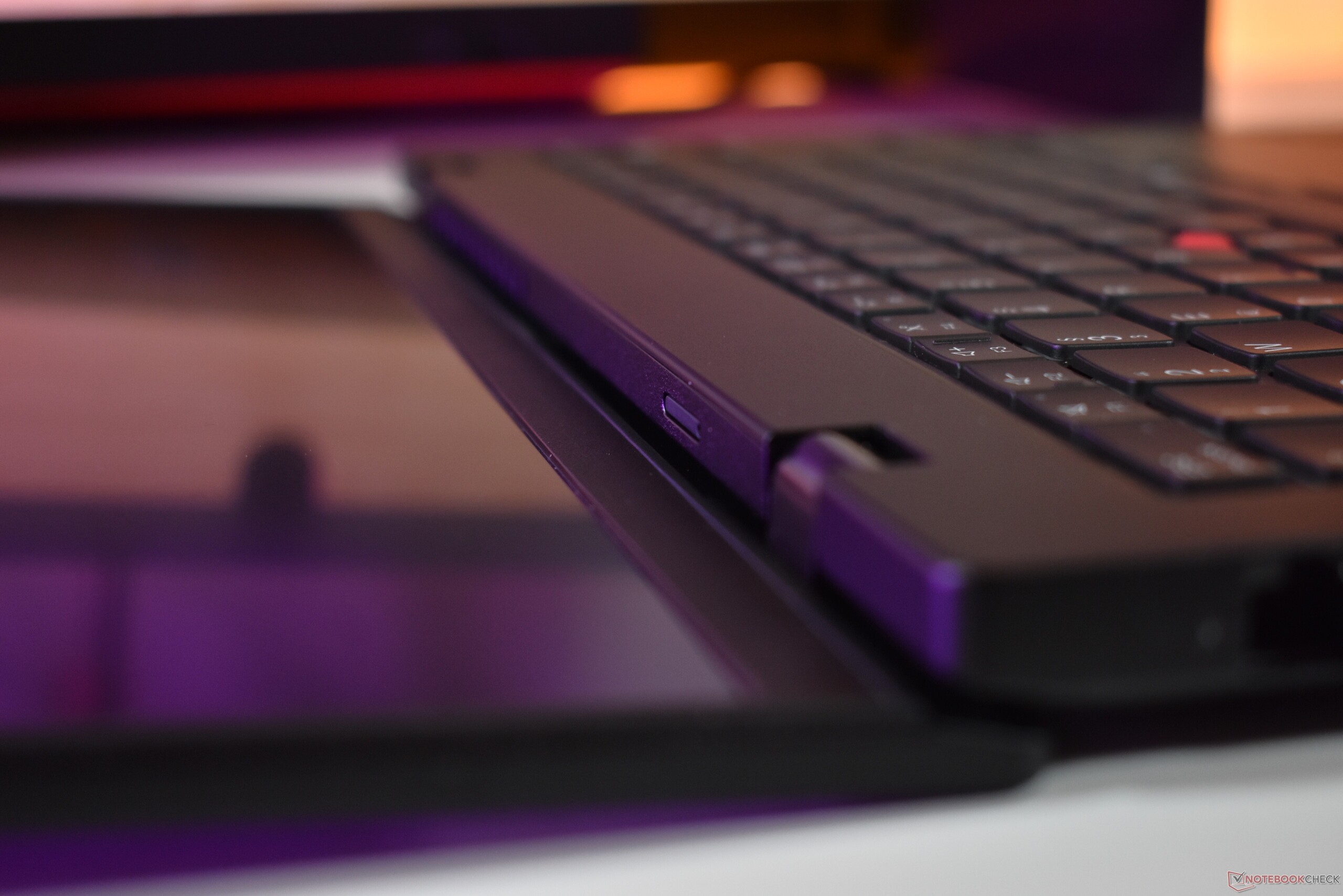 A Lenovo ugyanazokat a fém zsanérokat használja, mint az említett ThinkPad T14 esetében. Ezek 180 fokos nyitási szöget tesznek lehetővé, és kevés az imbolygás, de egy kézzel nem lehet kinyitni a fedelet.