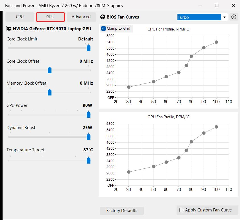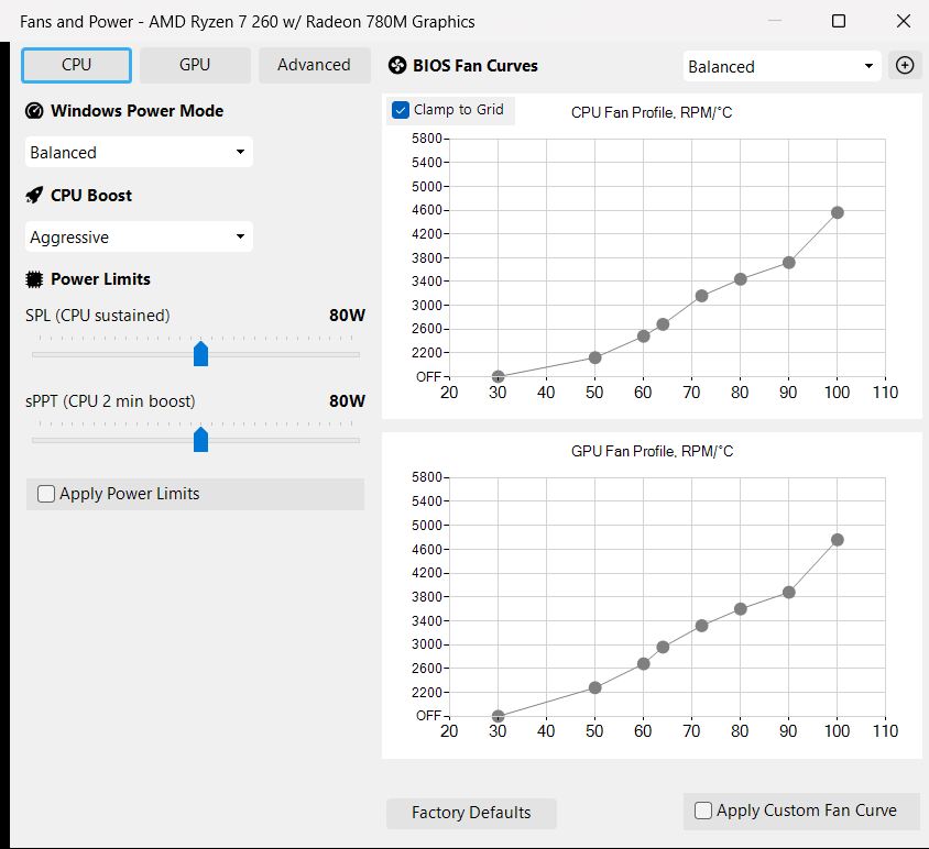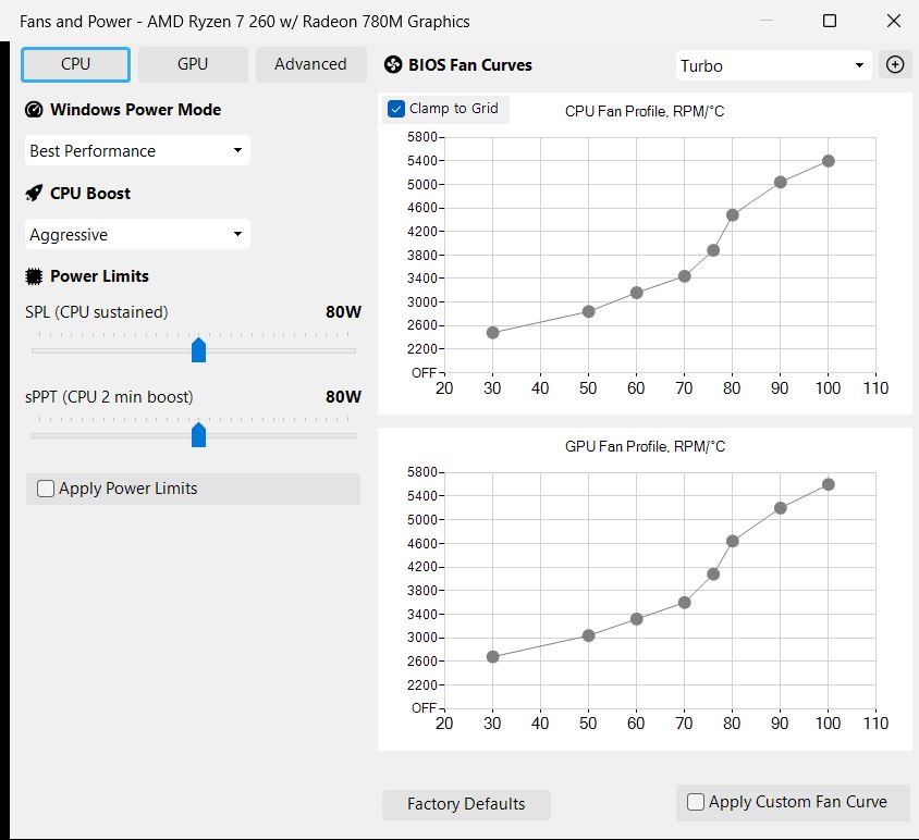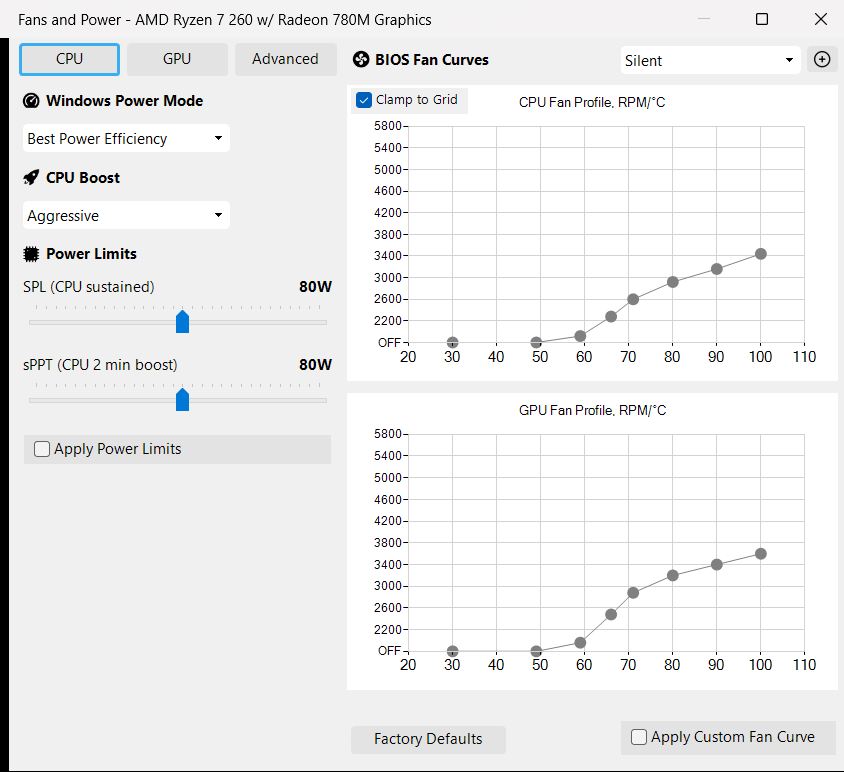 Teljesítményprofilokat válthat, manuálisan meghatározhatja a ventilátor görbéket és teljesítménykorlátokat az egyes profilokhoz, és mindent kényelmesen kezelhet. Ezek a határértékek a BIOS-ból kerülnek kiolvasásra, vagyis minden változtatás a hivatalos specifikáción belül marad.