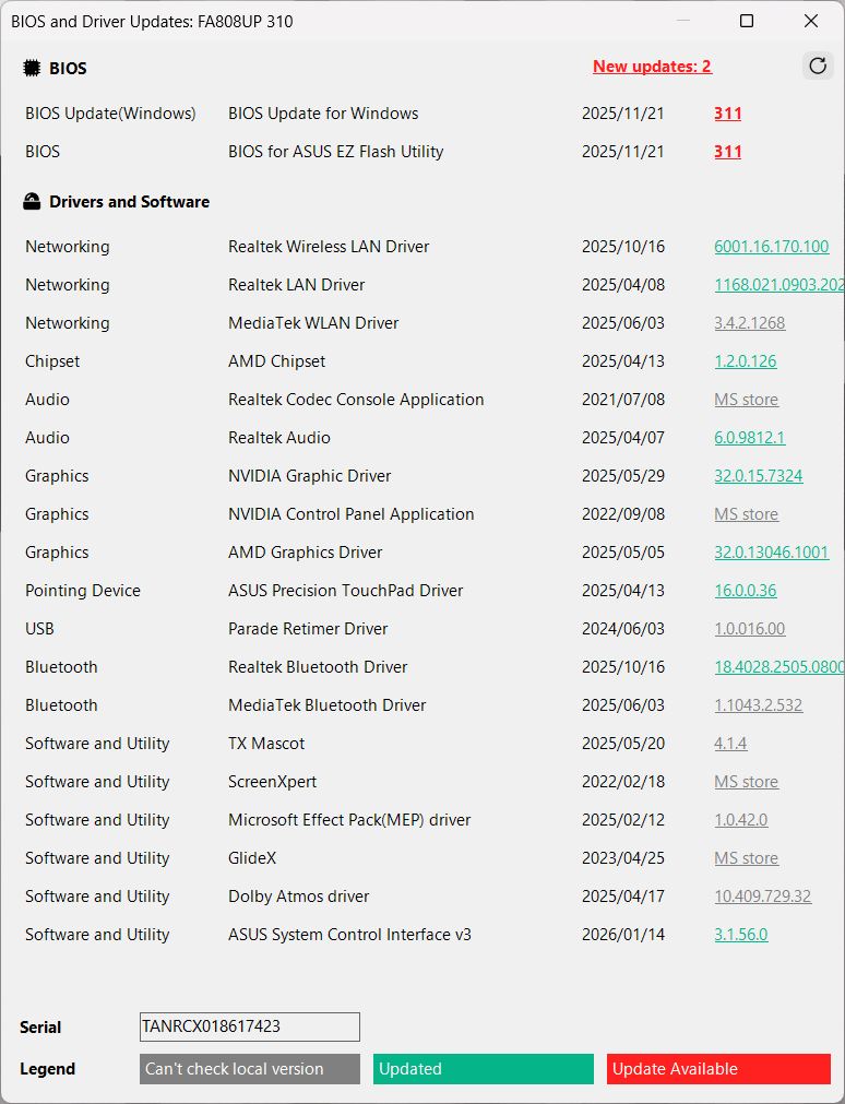 - Az eszköz továbbá megjeleníti az elérhető frissítéseket és a különböző illesztőprogramok telepített verzióit - ez olyan funkció, amelyhez egyébként MyAsusra lenne szükség. Ebben a tekintetben a G-Helper hatékonyan egyesíti az Armoury Crate és a MyAsus szerepét egyetlen alkalmazásban.
