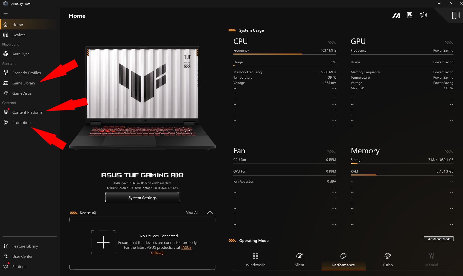 Az Armoury Crate lassan indul, néha egyáltalán nem töltődik be, valamint felfújtnak és lassúnak tűnik. A kezelőfelülete zsúfolt a játékkönyvtár, a tartalomplatformok és - ami a legfontosabb - a promóciós tartalmak lapjaival. Ráadásul túl sok Asus-folyamatot indít a háttérben.