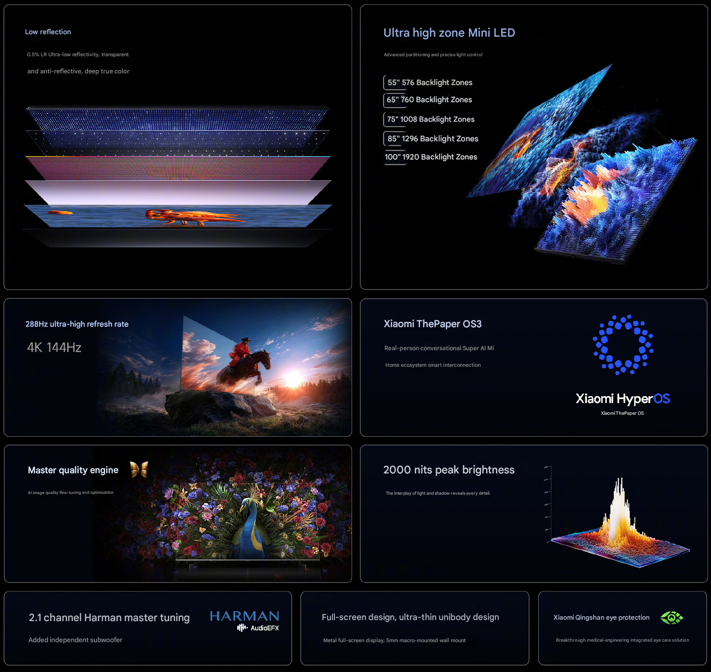 A továbbfejlesztett Xiaomi S Mini LED TV-család emellett akár 288 Hz-es képfrissítési frekvenciával zökkenőmentes játékélményt ígér, az alacsony tükröződésű bevonattal pedig a kijelzők célja, hogy különböző fényviszonyok mellett is kényelmes nézési élményt nyújtsanak. Az audio részlegben 2.1 csatornás hangrendszer található Harman AudioEFX hangolással. Tekintse meg korábbi beszámolónkat hogy többet megtudjon erről a sorozatról.
