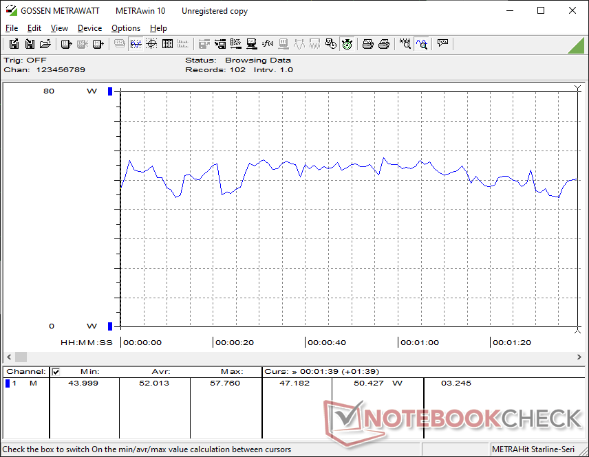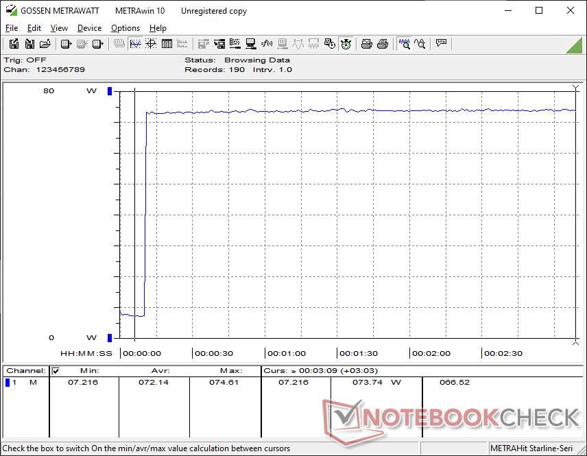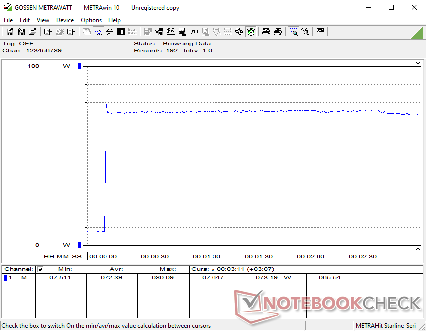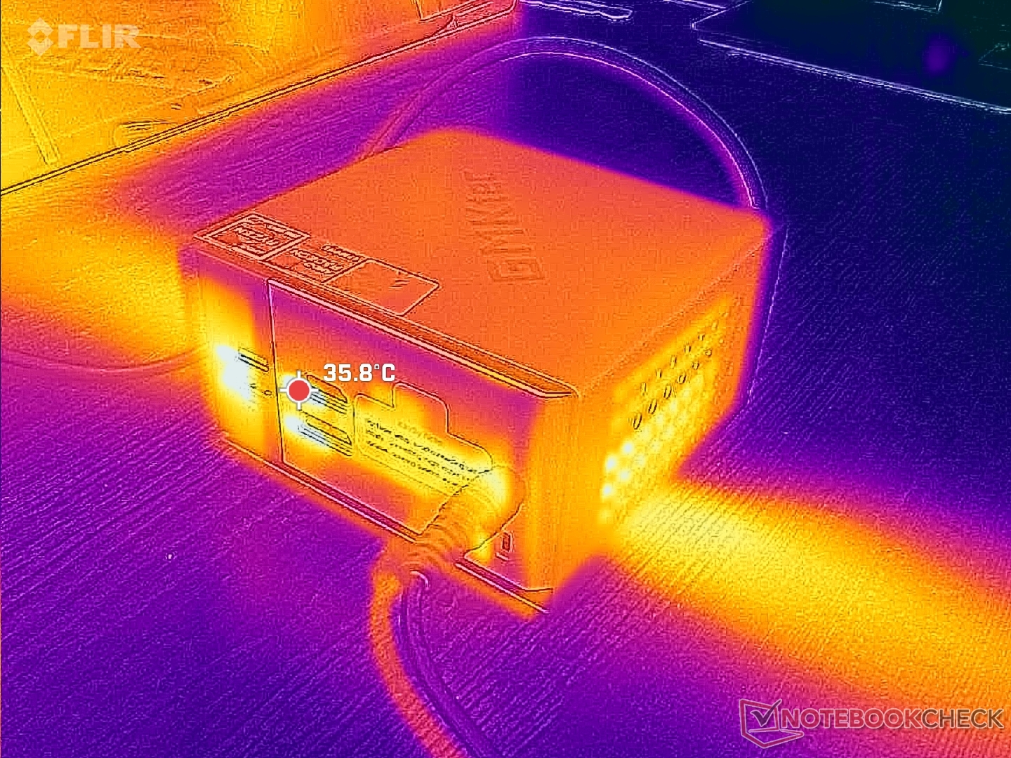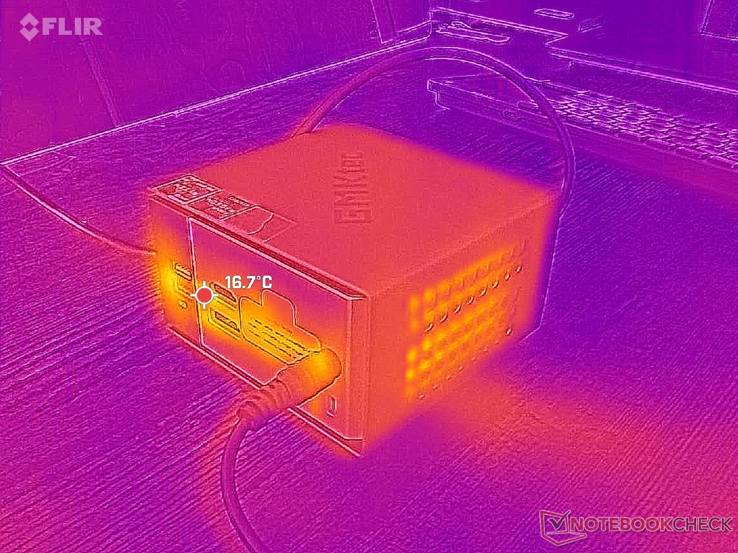 A közepes méretű (~13,3 x 5,8 x 3,2 cm) 120 W-os hálózati tápegységből 80 W maximális fogyasztást tudtunk mérni.