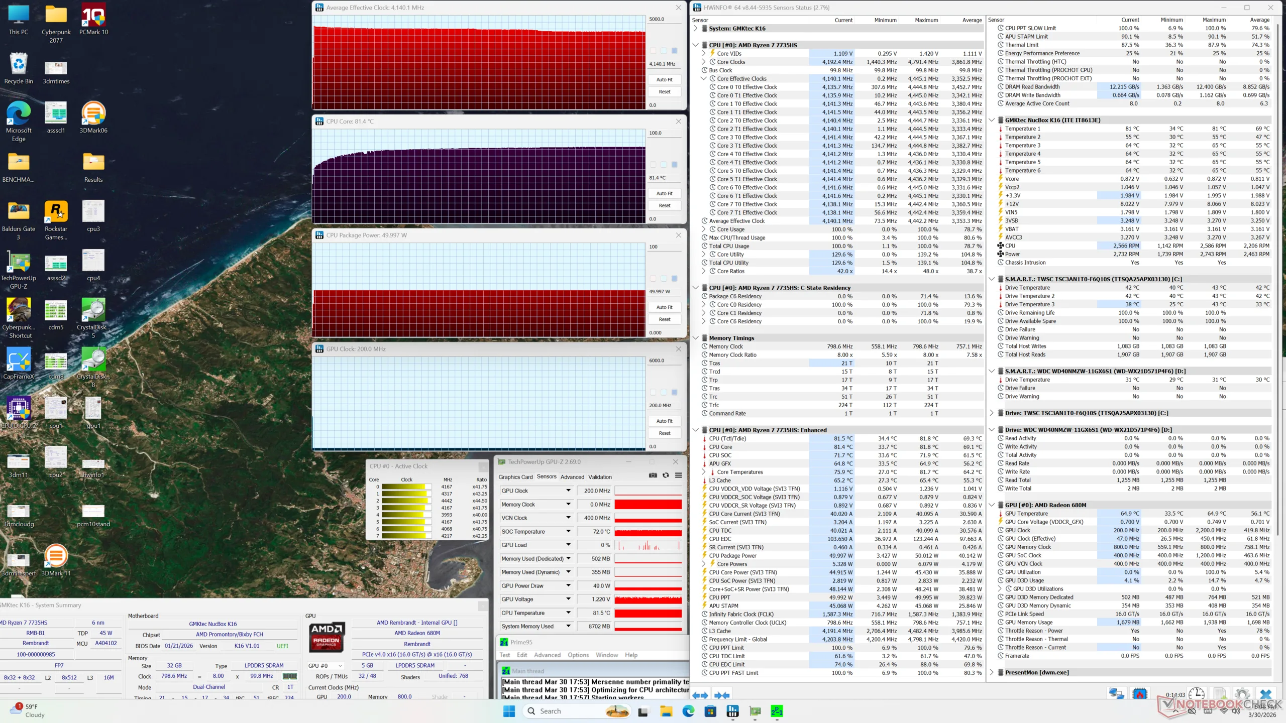 A CPU 4,1 GHz-en, 50 W-on és 81 C-on stabilizálódott a Prime95 stressz futtatása során, ami valójában melegebb, mint amit a mérések során rögzítettünk EVO-X1 az újabb és gyorsabb Zen 5 CPU-val. A maghőmérséklet továbbra is néhány C fokkal melegebb volt a játékok futtatásakor is. A NucBox K13 a hatékonyabb Core Ultra 7 256V processzorral gyorsabb játékteljesítményt és hűvösebb üzemi hőmérsékletet kínál.