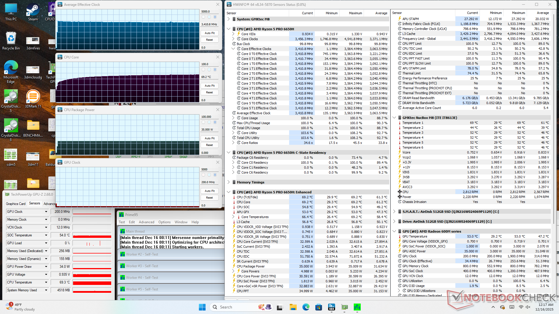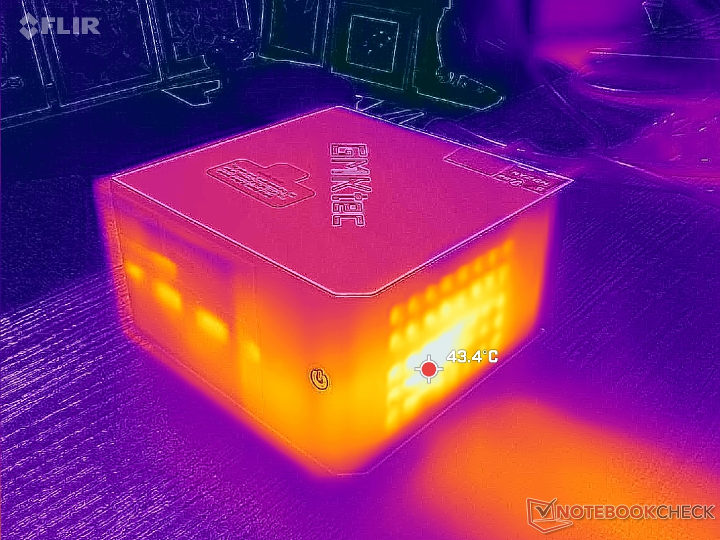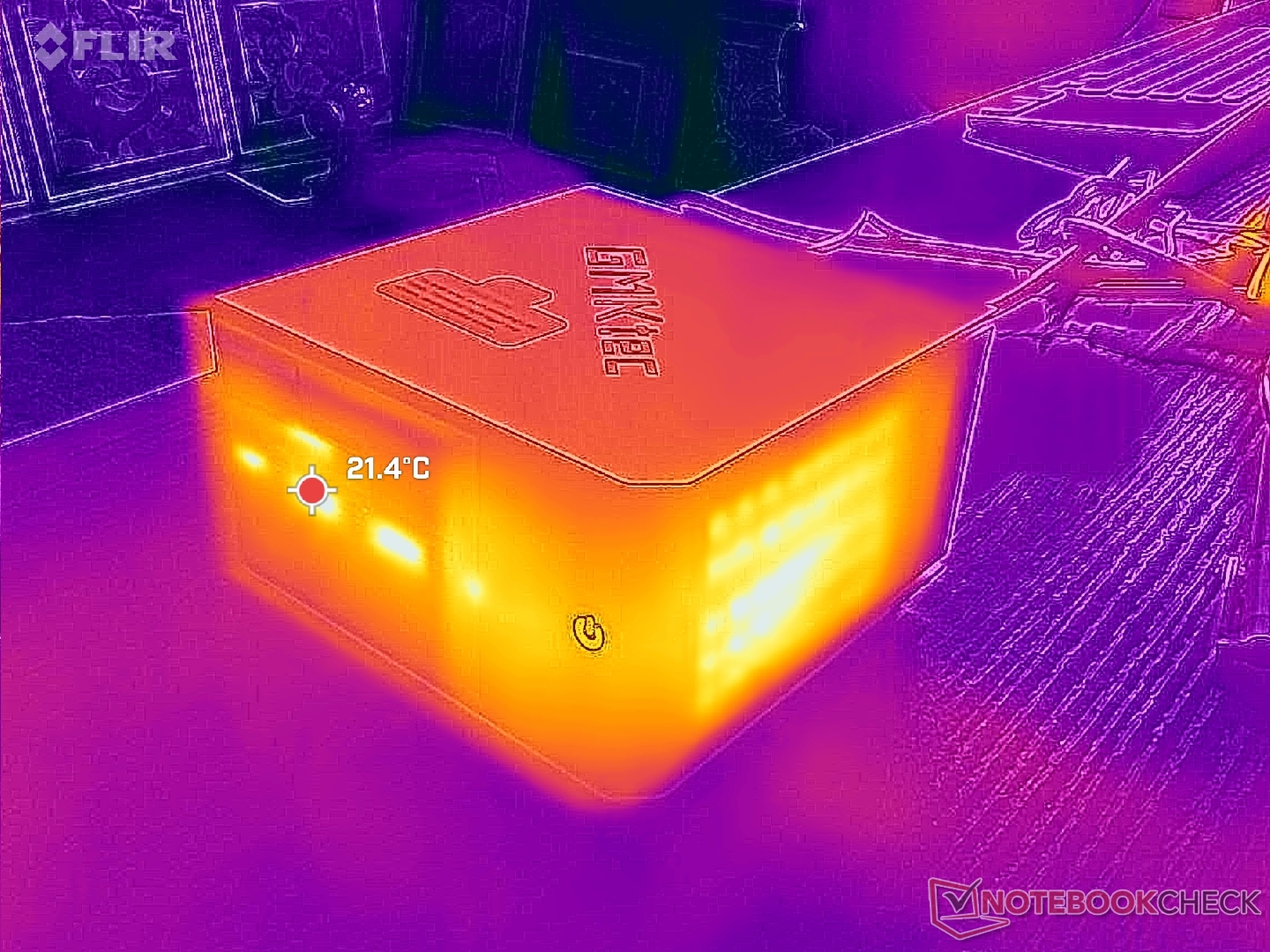 A CPU 3,4 GHz-en, 35 W-on és 69 C-on stabilizálódik Prime95 stressz futtatásakor, illetve 1900 MHz-en és 67 C-on, ha igényes terhelést, például játékokat futtat. A hőmérséklet valamivel melegebb, mint az MSI Cubi NUC AI+ 2MG esetében, amely a gyorsabb és újabb Intel Lunar Lake-V CPU-t használja.