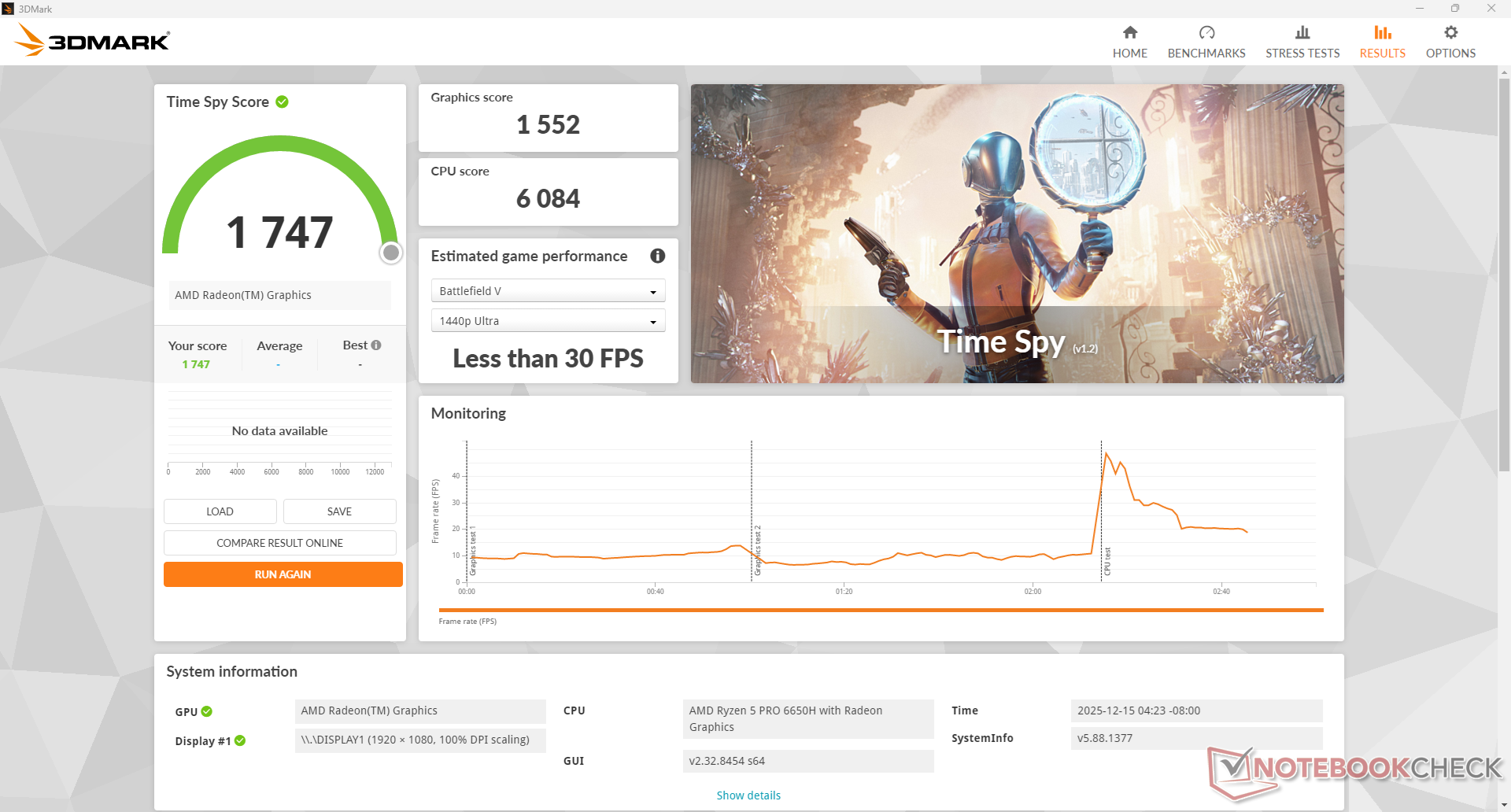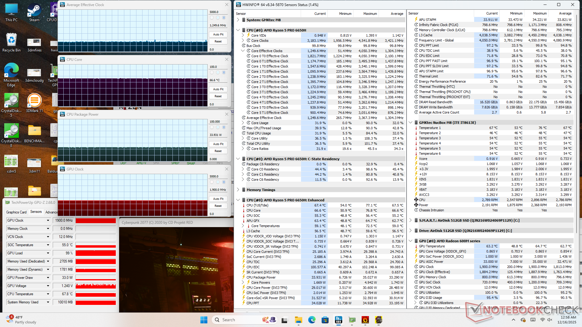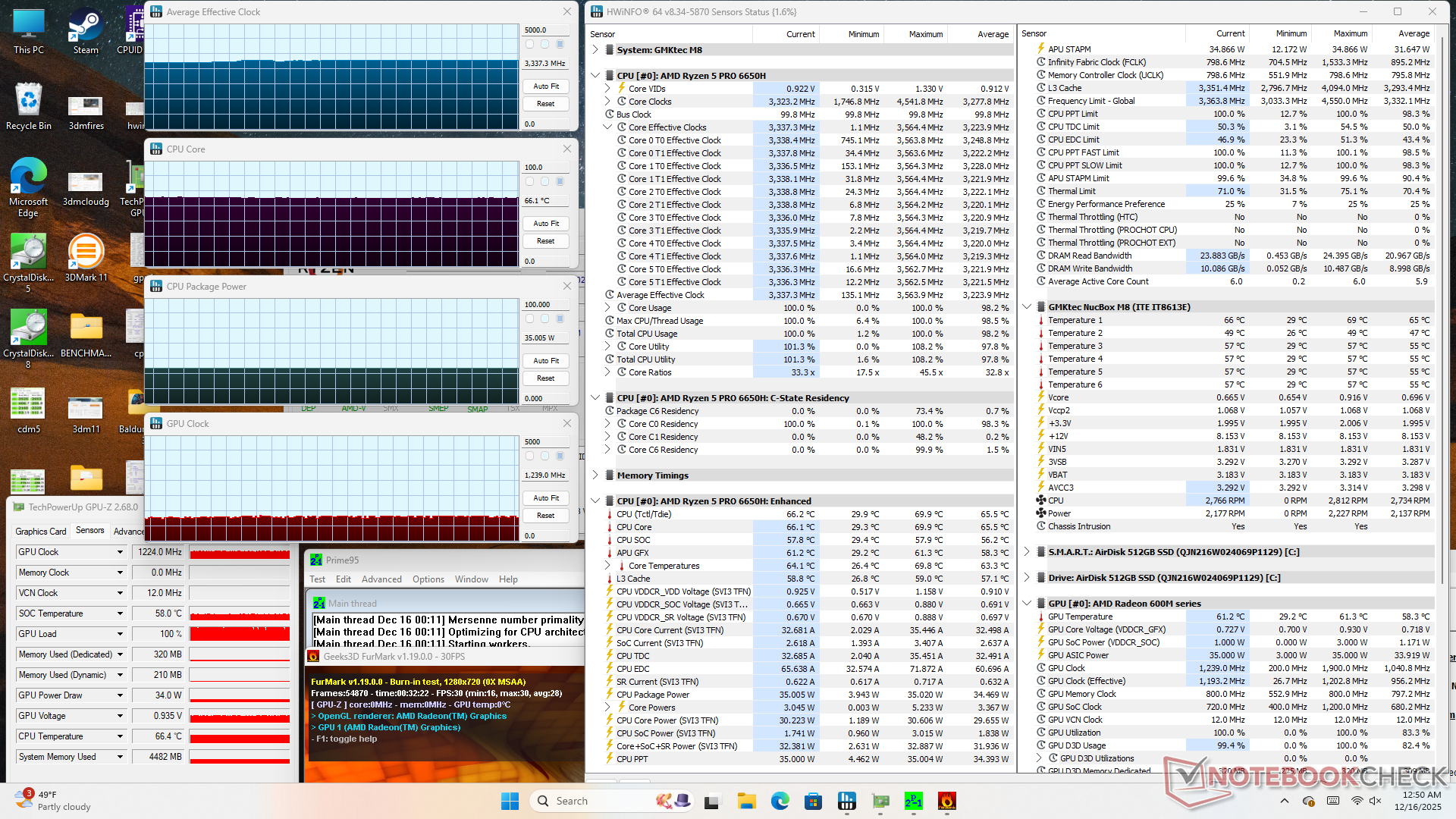 A CPU 3,4 GHz-en, 35 W-on és 69 C-on stabilizálódik Prime95 stressz futtatásakor, illetve 1900 MHz-en és 67 C-on, ha igényes terhelést, például játékokat futtat. A hőmérséklet valamivel melegebb, mint az MSI Cubi NUC AI+ 2MG esetében, amely a gyorsabb és újabb Intel Lunar Lake-V CPU-t használja.