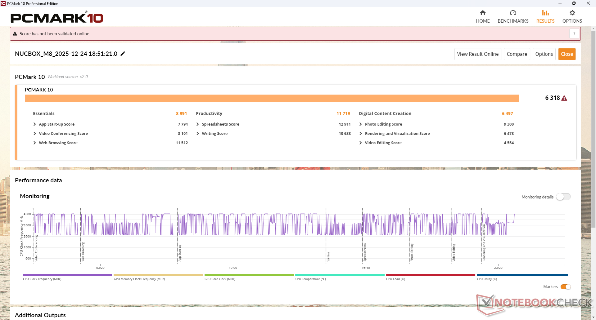 Az összfogyasztás magasabb, mint az újabb és hatékonyabb Core Ultra 7 258V processzorral felszerelt MSI Cubi NUC AI+ 2MG esetében. A wattonkénti teljesítmény viszonylag gyenge a Zen 3+ architektúrától.
