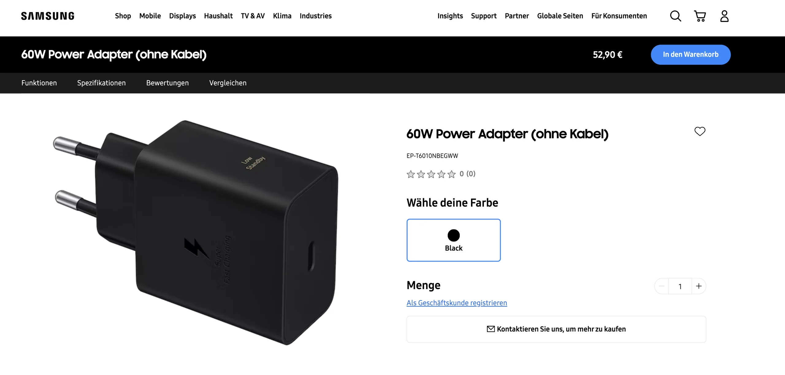 Amint az alábbi képernyőképen látható, a CCC az SM-S948-at akár 60 W-os töltésre is tanúsította 20V/3A mellett. Ehhez a Samsung már számos regionális weboldalán felsorolt egy kompatibilis töltőt. Konkrétan a vállalat 52,90 eurós (~62 dollár) áron kezdte el árulni az EP-T6010NBEGWW-t egyetlen USB Type-C porttal. Kevés esély van azonban arra, hogy a Samsung ezt a töltőt a Galaxy S26 Ultra készülékhez mellékeli.