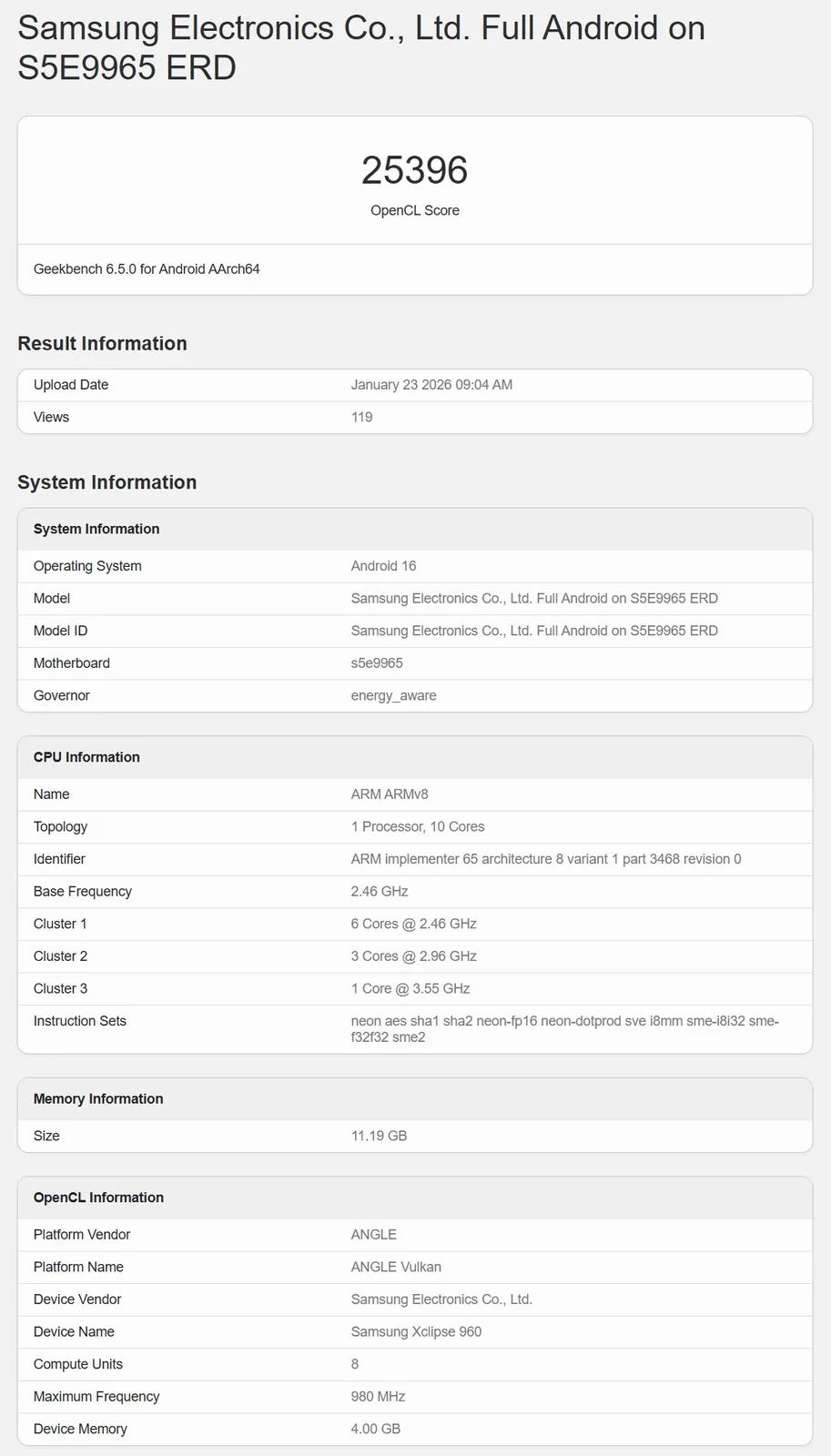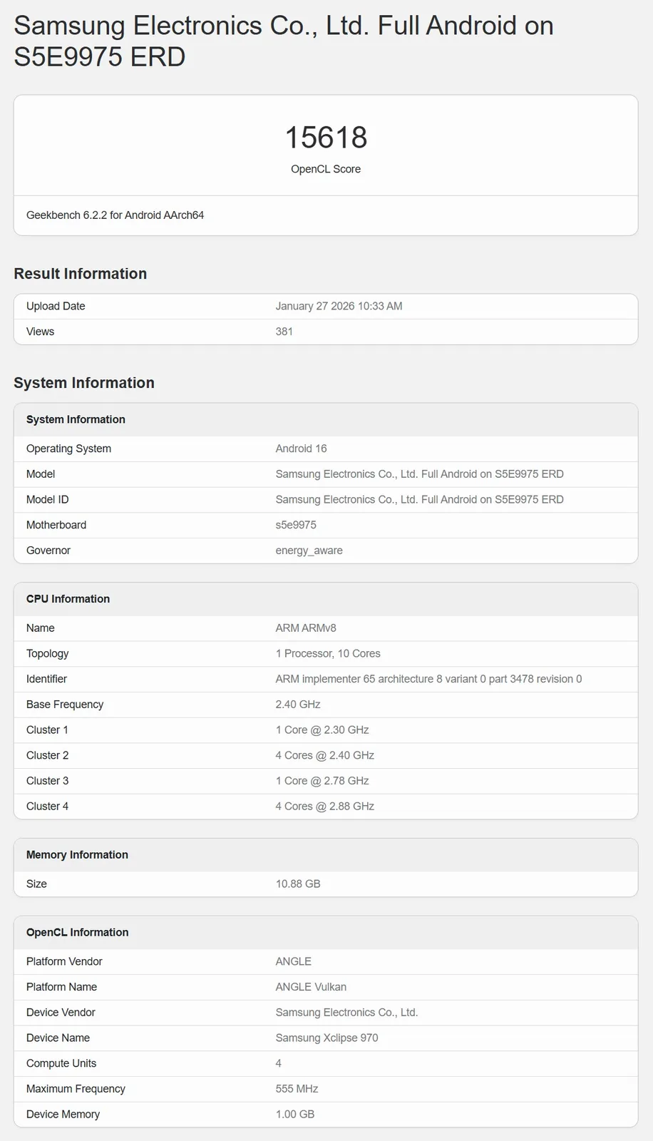 Ha az S5E9975 ERD számmal ellátott modell valóban a Samsung tesztrendszere az utódjának, a Exynos 2600, akkor jelenleg nagyon rosszul teljesít. Itt a GPU teljesítményét mérték, amely a várakozásoknak megfelelően egy Samsung Xclipse 970, és a Geekbench szerint 4 számítási egységgel van felszerelve 555 MHz-es órajelen. Ez nagyjából feleannyi és feleannyira gyors, mint az Exynos 2600-as tesztrendszer, amely a Geekbench-en már megjárta a címet többször is. Figyelembe véve, hogy a GPU csak körülbelül fele olyan erős, az OpenCL tesztben elért 15 618 pontos eredmény nem túl rossz, de persze még mindig jelentősen elmarad az Exynos 2600-as tesztrendszer szintjétől