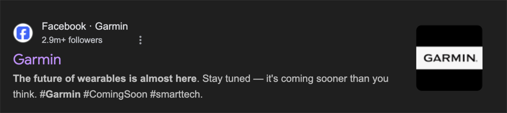 Most egy nemrégiben megjelent bejegyzés a Garmin India Facebook oldalán újabb spekulációkat indított el arról, hogy a vállalat valamiféle Whoop alternatívát fejleszt. A the5krunner által Garmin Recovery Band-nek nevezett the5krunner és Gadgets & Wearables, többek között, az ismeretlen eszközre nem utal név szerint a Garmin Facebook-bejegyzése. Ehelyett a vállalat azzal ugrat, hogy a "viselhető eszközök jövője már majdnem itt van", hozzátéve, hogy "hamarabb jön, mint gondolnád".