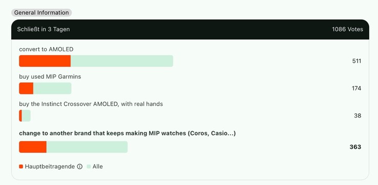 Egy felmérés a Reddit oldalon azt mutatja, hogy az 1086 válaszadóból összesen 537 vásárló vagy egy régebbi, MiP kijelzővel ellátott modellt vásárolna, vagy más márkára váltana, ha a Garmin feladná a MiP-et. Mindössze 511 vásárló fontolná meg a váltást egy AMOLED panellel ellátott modellre. 38 válaszadó inkább az Instinct Crossover-t választaná, amely az AMOLED panelt óramutatókkal kombinálja