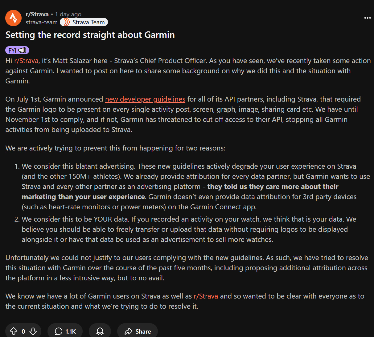 Eközben a Strava úgy véli, hogy a Garmin visszaél a 9297651 és 9778053 szabadalmakkal, amelyek a Strava állítása szerint a "felhasználó által preferált tevékenységtérképek generálására" vonatkoznak. Egyelőre nem világos, hogy ez a peres eljárás milyen hatással lesz a Garmin szoftver- és hardvercsaládjaira, ha egyáltalán lesz ilyen hatása. Mindezek mellett a Strava termékigazgatójának Reddit-en nemrégiben közzétett bejegyzése arra utal, hogy a vállalatnak a Garmin-nal kapcsolatos problémái nem csupán szabadalmi problémákra utalnak. Screenshotted, ha a jövőben eltávolítjuk, további részletekért lásd DC Rainmaker alábbi magyarázatát.