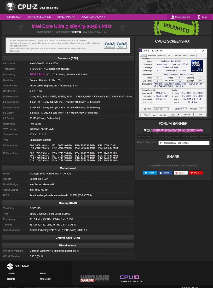 Hicookie kijelentette: "13K elért! Hatalmas köszönet az ADATA Technology-nak a csillagos memóriáért és az Intel Core Ultra 285K-nak - a memóriavezérlője fenomenális. A GIGABYTE Z890 AORUS TACHYON ICE-vel párosítva a DDR5-öt 13 000 MT/s fölé toltuk"