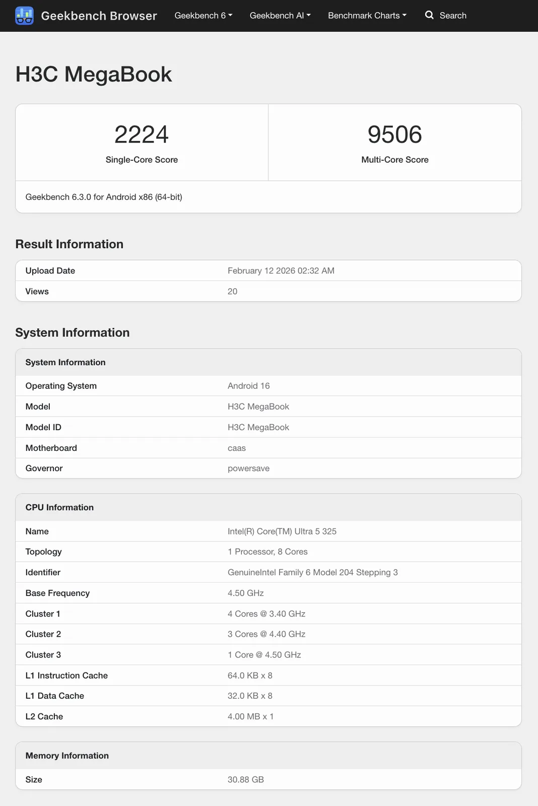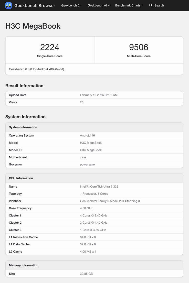Most úgy tűnik, hogy a tavalyi H3C MegaBook Panther Lake-alapú utódja már majdnem itt van. Hivatalosan egyelőre nem találjuk, hogy a H3C utalna a MegaBook új verziójára. A Geekbench azonban tele van H3C MegaBook listákkal, amelyekben az Intel Core Ultra 5 325 processzorral. Akár 32 GB RAM-mal párosítva a Core Ultra 5 325 4 P maggal és 4 Low Power maggal rendelkezik, 4,5 GHz-es, illetve 3,4 GHz-es csúcsórajelsebességgel.