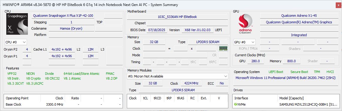 | HP EliteBook 6 G1q 14 Qualcomm Snapdragon X Plus X1P-42-100 ⎘ Qualcomm SD X Adreno X1-45 1.7 TFLOPS ⎘ 32 GB Memória, 512 GB SSD | Amazon: $1,372.03 List Price: 1300 USD | 1.5 kg | 17 mm | 14.00" 1920x1200 162 PPI IPS | |
