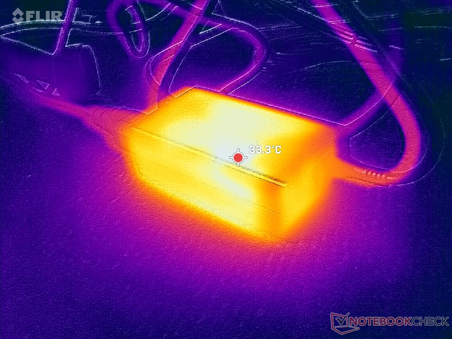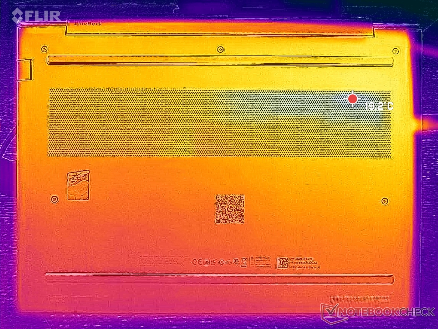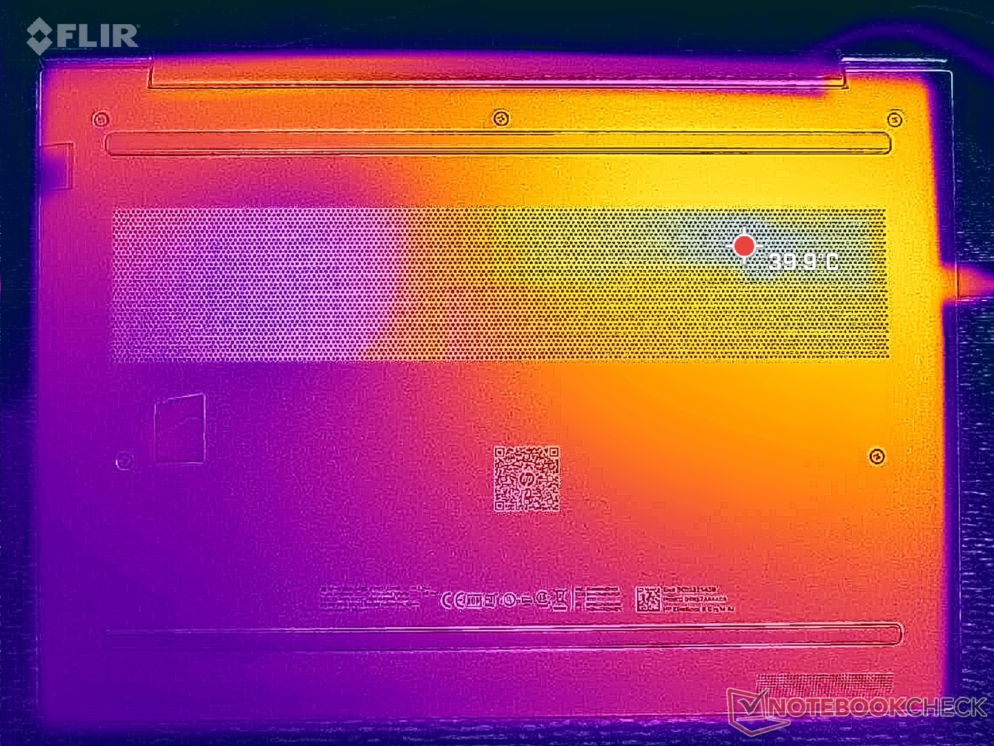 A felszíni hőmérséklet észrevehetően melegebb az alváz bal felén, a processzor közelében. A forró pontok elérhetik a 40 C körüli hőmérsékletet, ami csak kicsivel hűvösebb, mint amit az Intel-üzemű ThinkPad E14 Gen 7.
