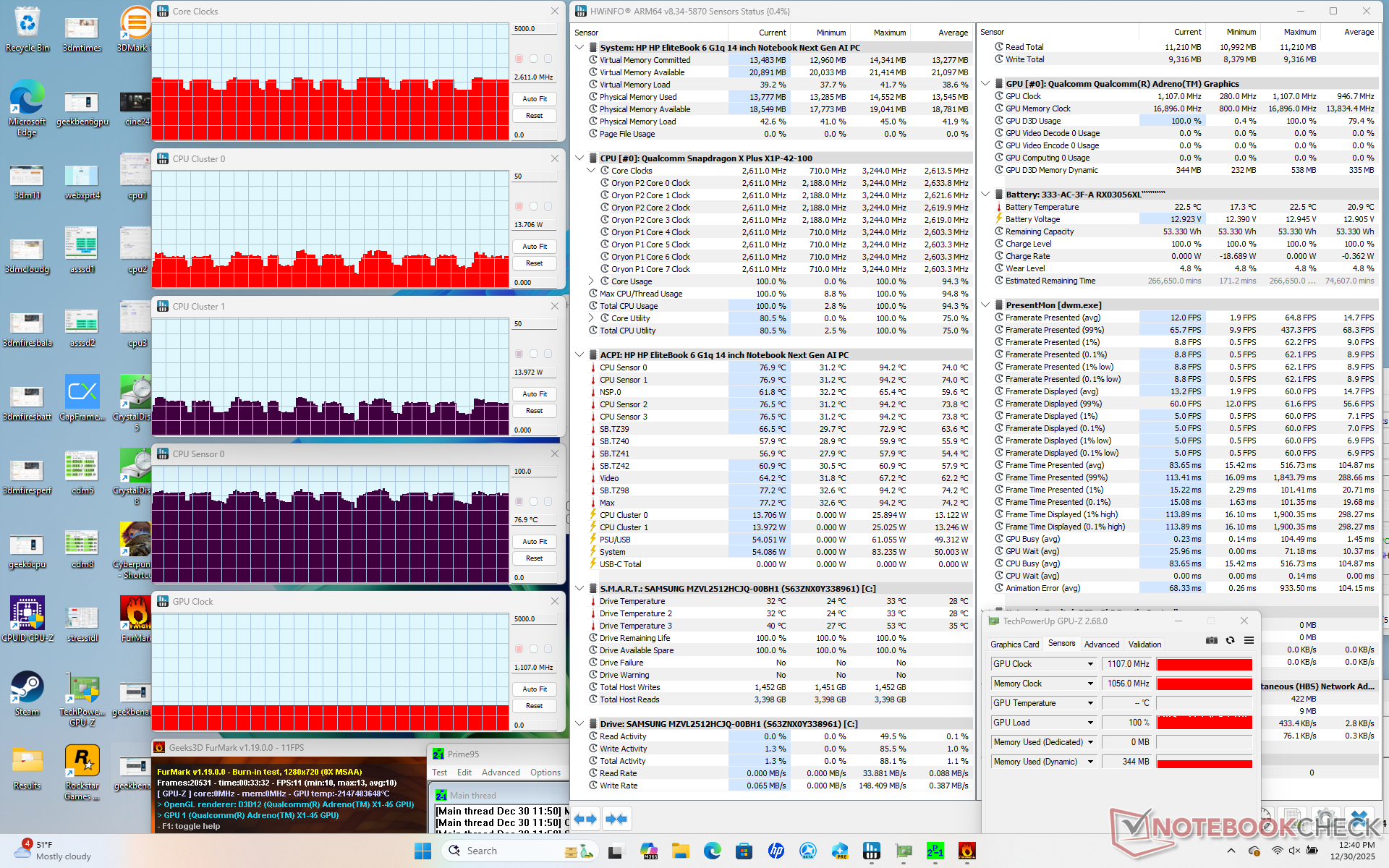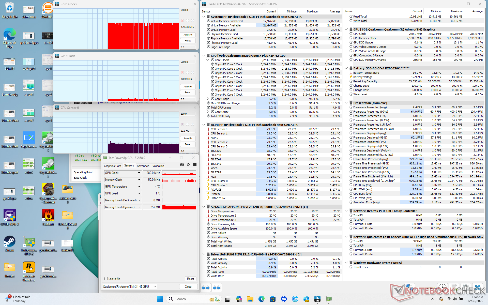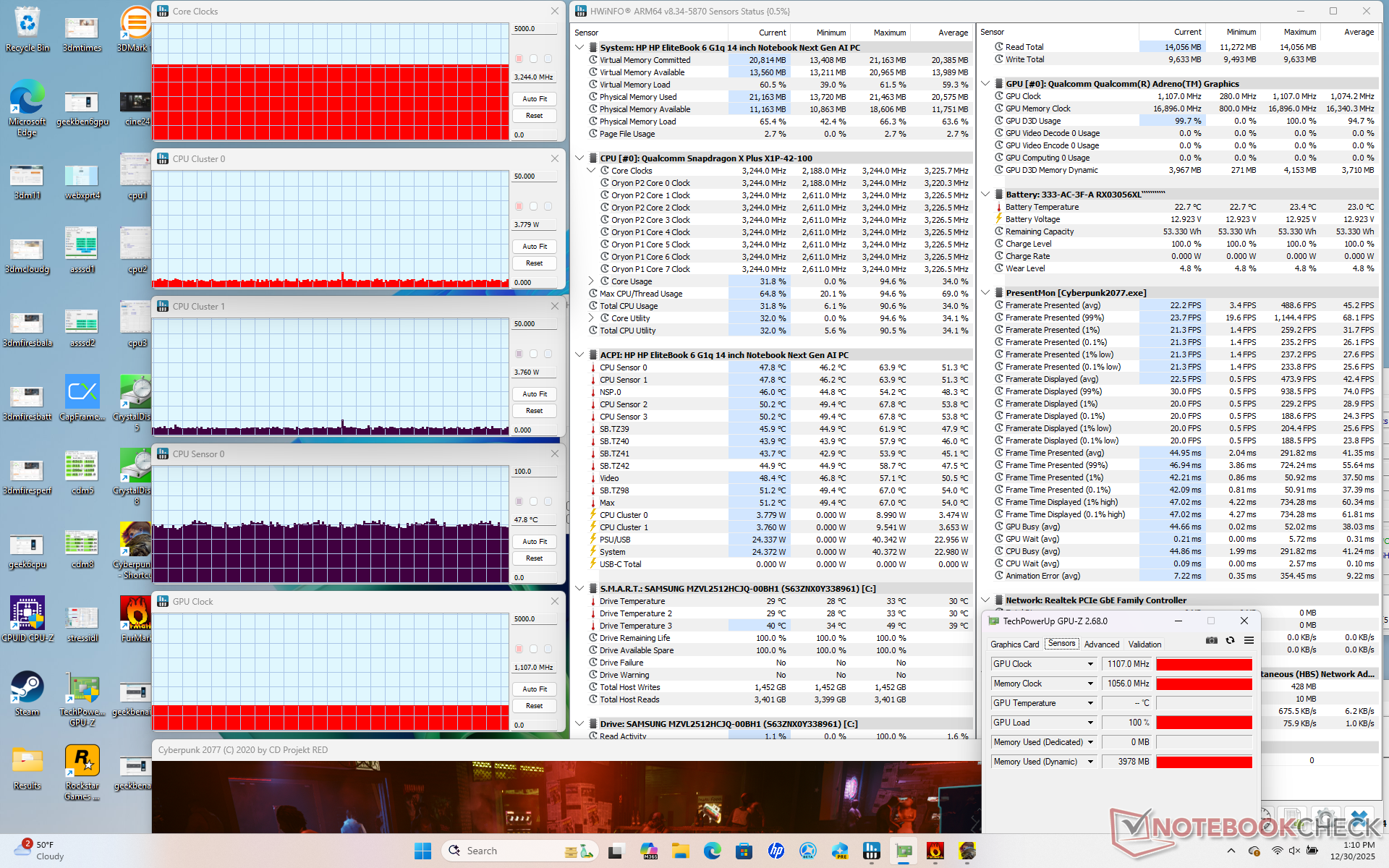 A Snapdragon-alapú EliteBook várhatóan nagyon hatékony, különösen a mindennapi munkamenetek, például böngészők vagy videók futtatásakor. Igényesebb lehet, mint egy Core Ultra 7 258V rendszer, mint például a ThinkPad T14 G6 amikor a CPU teljesen ki van terhelve, de ugyanakkor gyorsabb teljesítményt kínál hasonló teljesítmény/watt szint mellett.